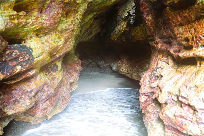 Ngay bên cạnh hang Mũi Trâu là một bãi biển nhỏ, mực nước nông, quanh năm sóng vỗ, rất lý tưởng để tắm biển. Ảnh: Xuân Tiến/TTXVN