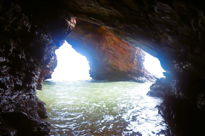 Từ trong hang nhìn ra, cửa hang Mũi Trâu có 2 khoảng sáng thông ra biển, tựa như lỗ mũi của con trâu. Ảnh: Xuân Tiến/TTXVN