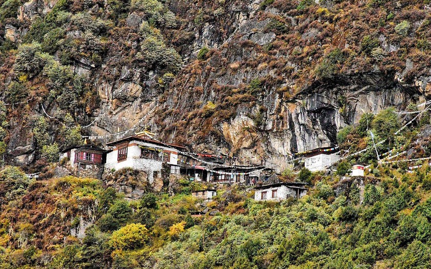 Nằm trong số những công trình cao nhất của Bhutan, tu viện Thujedra cheo leo bên sườn vách đá cao gần 4.000m như lơ lửng lưng chừng trời phía trên Thủ đô Thimphu. Ảnh: bhutanpilgrimage
