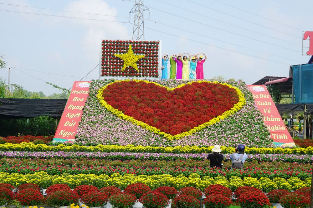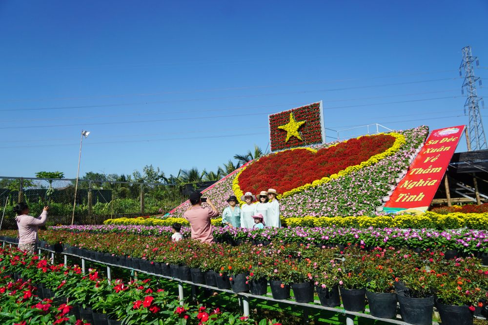 Tại Tổ Sản xuất và cung ứng hoa kiểng khóm Tân An (phường Sa Đéc, tỉnh Đồng Tháp), những ngày này luôn tấp nập khách tham quan. Điểm nhấn nổi bật nhất chính là tiểu cảnh “Trái tim làng hoa” kết hợp cùng hình ảnh lá cờ đỏ sao vàng tung bay.