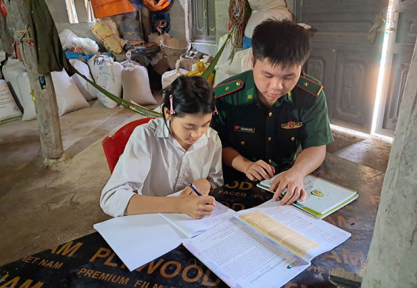 Cán bộ Đồn Biên phòng Quang Long thường xuyên qua nhà hướng dẫn cháu Hoàng Nguyệt Mai học tập.