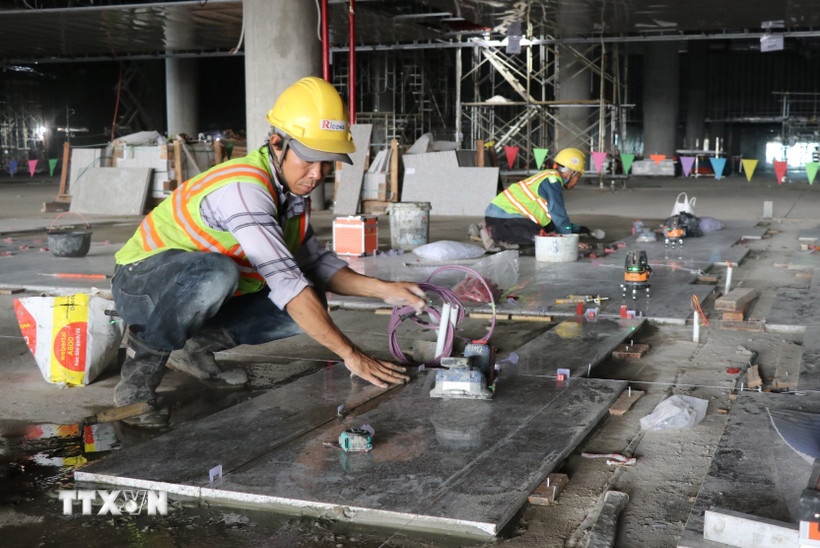 Công nhân lát đá sàn tầng 1 nhà ga hành khách sân bay Long Thành. Ảnh: Công Phong/TTXVN.