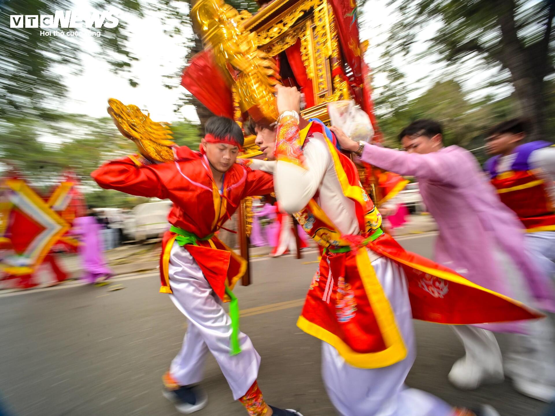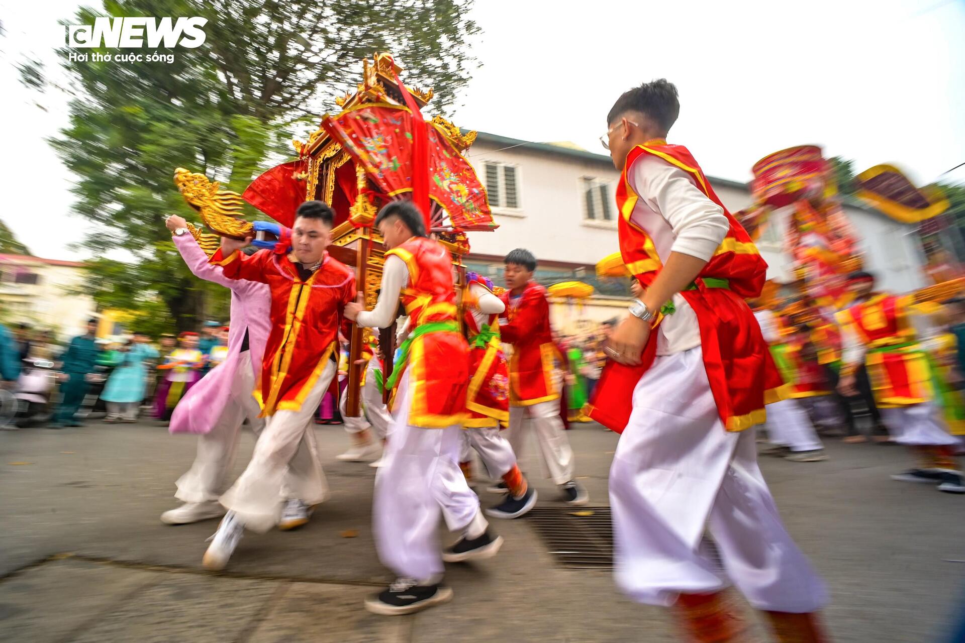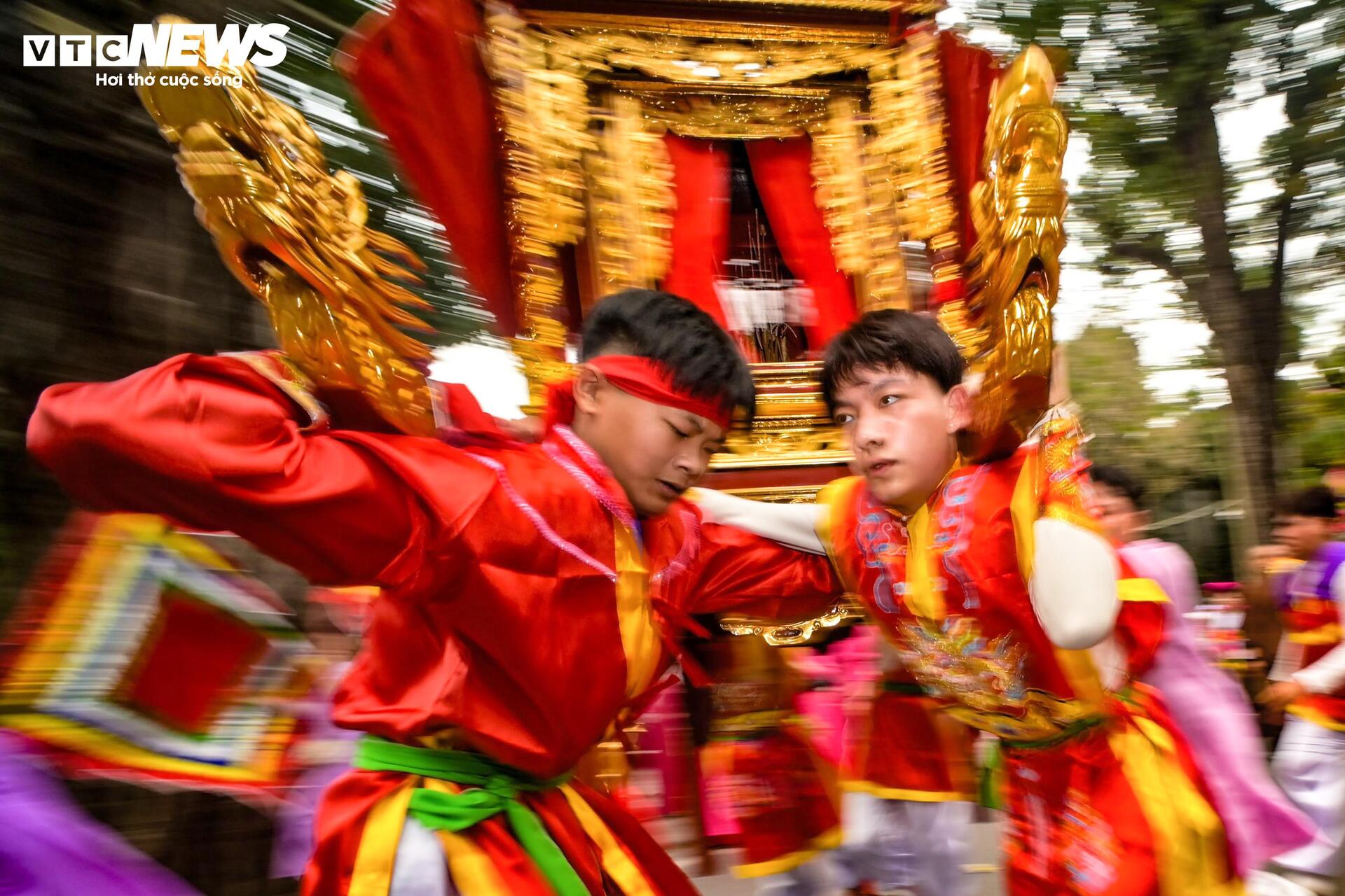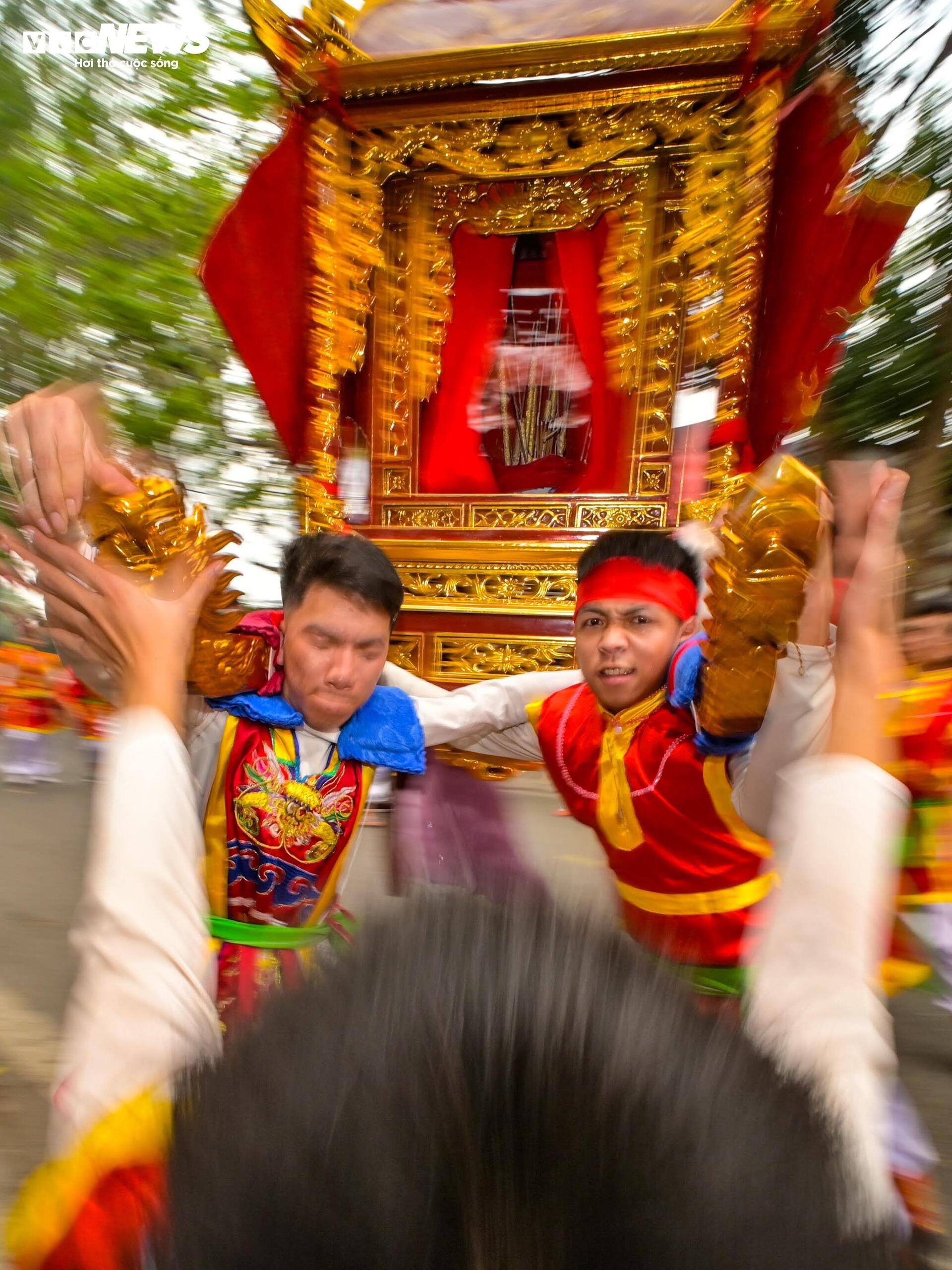Hàng chục thanh niên trai tráng trong các giáp nhanh chóng vào vị trí, đồng loạt nhấc cỗ kiệu sơn son thếp vàng.