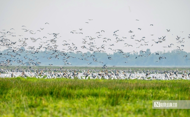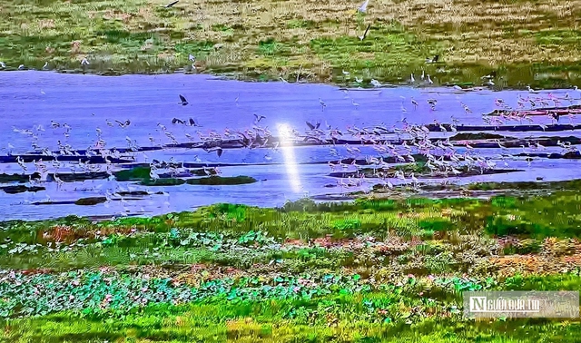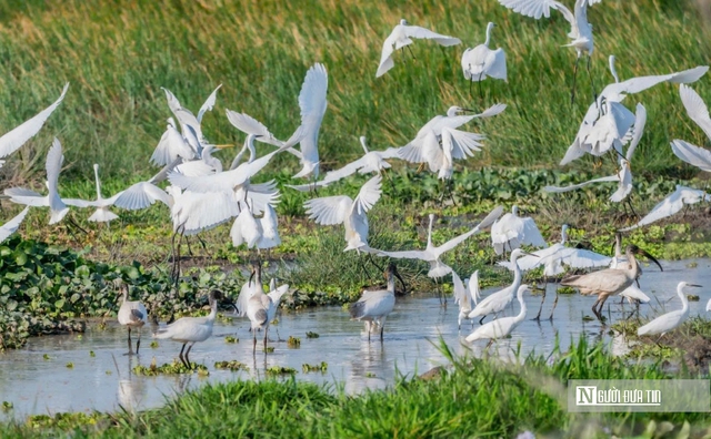 Nhờ những giải pháp đồng bộ trong phục hồi sinh cảnh, hệ sinh thái đất ngập nước tại đây đang dần “hồi sinh”. Nhiều loài thủy sinh đặc trưng như nhĩ cán, hoa súng… xuất hiện trở lại với mật độ cao, tạo nguồn thức ăn dồi dào cho các loài chim. Trên các bãi cỏ và vùng đầm lầy, hàng loạt loài chim như cò trắng, cò ốc, le le, giang sen… xuất hiện ngày càng nhiều. Có thời điểm, số lượng cá thể lên đến hàng nghìn con, tạo nên bức tranh thiên nhiên đầy sức sống. (Ảnh: Nguyễn Thị Nga - Vườn quốc gia Tràm Chim).