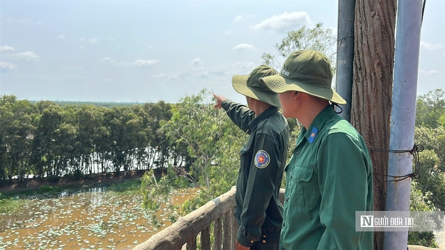 Lực lượng bảo vệ cơ động Vườn quốc gia Tràm Chim tuần tra từ đài quan sát. (Ảnh: Bùi Đạt)