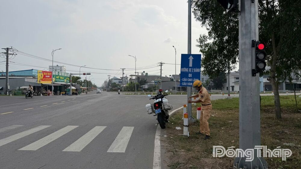 Lực lượng Cảnh sát giao thông lắp đặt các biển báo.