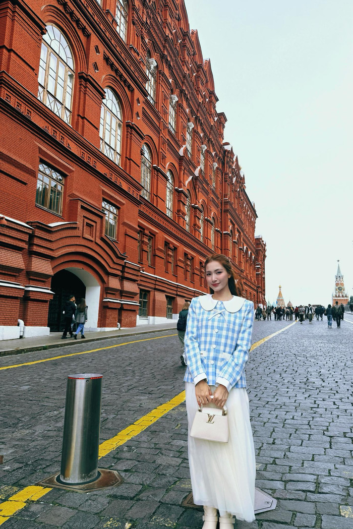 Nữ ca sĩ sử dụng chiếc túi do Văn Toàn tặng trong chuyến đi Nga gần đây.