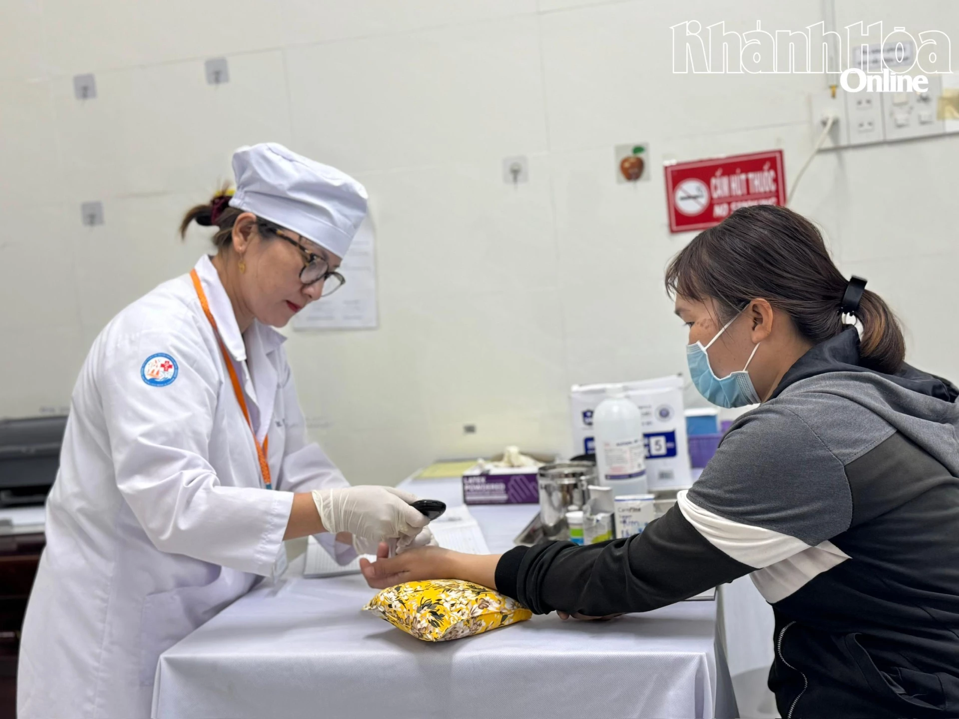 Cán bộ y tế Trạm Y tế phường Nha Trang xét nghiệm nhanh đường huyết cho người dân.