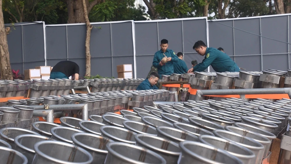 Các cán bộ, chiến sĩ cùng đơn vị dân quân và lực lượng tăng cường của Bộ Tư lệnh Thủ đô đang nỗ lực làm việc để mang đến màn trình diễn mãn nhãn và an toàn cho người dân vào đêm Giao thừa đón Tết Nguyên đán 2026.Ảnh: MINH TRÚC