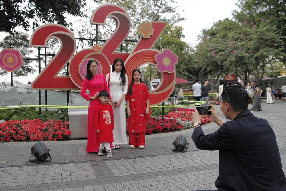 Theo ghi nhận của PV, từ chiều 16-2, rất nhiều người dân đã tập trung tại khu vực Hồ Gươm để chụp những bức ảnh kỷ niệm hoặc chọn cho gia đình một vị trí đẹp để xem pháo hoa. Ảnh: MINH TRÚC