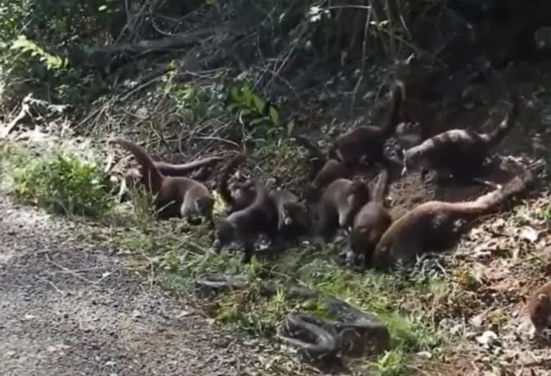 Trong đoạn clip, con trăn bị cả đàn chồn bạc má kéo đến bao vây. Chúng liên tục phối hợp, thay nhau tấn công khiến trăn không kịp phản kháng. Trước sức ép từ số đông, con bò sát nguy hiểm dần kiệt sức.