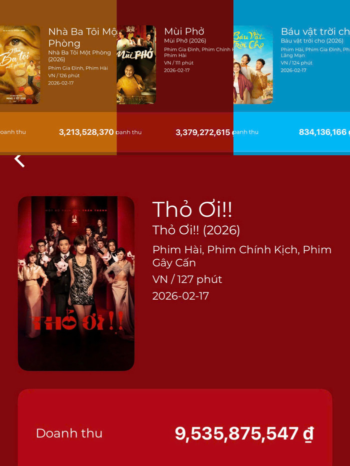 Tuy nhiên, doanh thu chỉ là bề nổi của tảng băng chìm. Sự áp đảo thực sự nằm ở số lượng vé bán ra và suất chiếu. Theo số liệu của Box Official Việt Nam, số lượng suất chiếu dành cho Thỏ Ơi!! hiện đang gấp 3 lần so với phim của Trường Giang hay Xuân Hinh. Đây là hệ quả tất yếu của quy luật thị trường: Phim nào có tỷ lệ đặt chỗ cao sẽ được các nhà rạp ưu tiên phủ kín giờ vàng. Hiện tại, trung bình cứ 3 suất chiếu phim Việt thì có đến 2 suất dành cho tác phẩm của đạo diễn họ Huỳnh.