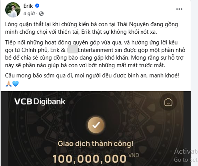 Erik ủng hộ 100 triệu đồng cho người dân ở Thái Nguyên. Ảnh: FB Erik.