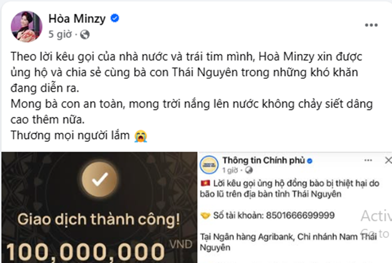 “Hòa Minzy xin được ủng hộ và chia sẻ cùng bà con Thái Nguyên trong những khó khăn đang diễn ra. Mong bà con an toàn, mong trời nắng lên nước không chảy siết dâng cao thêm nữa. Thương mọi người lắm”. Ảnh: FB Hòa Minzy.
