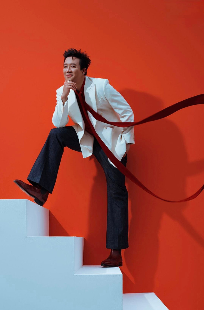 Trong bộ ảnh, Trấn Thành xuất hiện với hai tạo hình tương phản rõ rệt. Ở outfit đầu tiên, anh lựa chọn áo blazer trắng phom dáng cổ điển, kết hợp quần tối màu và giày da nâu. Điểm nhấn nằm ở chiếc cà vạt đỏ dài buông lơi, tạo hiệu ứng chuyển động nổi bật trên phông nền cam rực rỡ. Cách tạo dáng mạnh mẽ, tư thế bước lên bậc thềm giúp tổng thể vừa mang tinh thần thời trang đương đại, vừa gợi cảm giác tự tin, bản lĩnh của một nghệ sĩ giàu trải nghiệm,