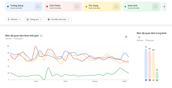 Dữ liệu tìm kiếm cũng củng cố xu hướng này. Trên Google Trends, mức độ quan tâm dành cho Trấn Thành và Trường Giang áp đảo hoàn toàn so với các diễn viên và đạo diễn khác trong vòng 24 giờ qua, đồng thời duy trì trong cả 7 ngày gần nhất. Điều này cho thấy sự chú ý của người dùng không còn dàn trải cho toàn bộ đường đua phim Tết, mà tập trung mạnh vào hai cái tên quen thuộc.