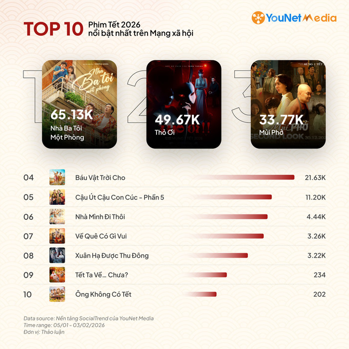 Theo thống kê từ YouNet Media, Nhà Ba Tôi Một Phòng hiện dẫn đầu bảng xếp hạng thảo luận phim Tết nổi bật với khoảng 65,13 nghìn lượt thảo luận, tạo khoảng cách đáng kể so với các vị trí phía sau. Thỏ Ơi! của Trấn Thành đứng ở vị trí tiếp theo, trong khi Mùi Phở và Báu Vật Trời Cho xếp sau với mức độ thảo luận thấp hơn. Những con số này cho thấy Trường Giang đang chiếm ưu thế về mặt tạo ra câu chuyện và chủ đề bàn luận trên mạng xã hội.