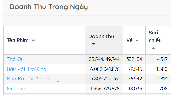 Ở chiều ngược lại, Báu vật trời cho bị nhận xét an toàn, thiếu cao trào mạnh, nhưng vẫn ghi điểm nhờ bối cảnh biển và diễn xuất của Quách Ngọc Ngoan. Nhà ba tôi một phòng của Trường Giang đang tiến gần mốc 100 tỷ, còn Mùi phở chật vật ở mức hơn 30 tỷ và đối diện áp lực hòa vốn.