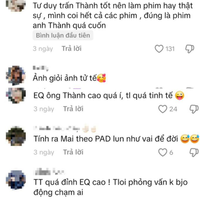 Phản ứng trên mạng xã hội cho thấy phần đông khán giả ghi nhận thái độ chuyên nghiệp của nam đạo diễn. Nhiều bình luận khen Trấn Thành "EQ cao", "trả lời đẳng cấp", "không động chạm ai". Giữa bầu không khí cạnh tranh gay gắt, phát ngôn này phần nào hạ nhiệt những suy đoán về mối quan hệ giữa nam nghệ sĩ và các diễn viên từng gắn bó.