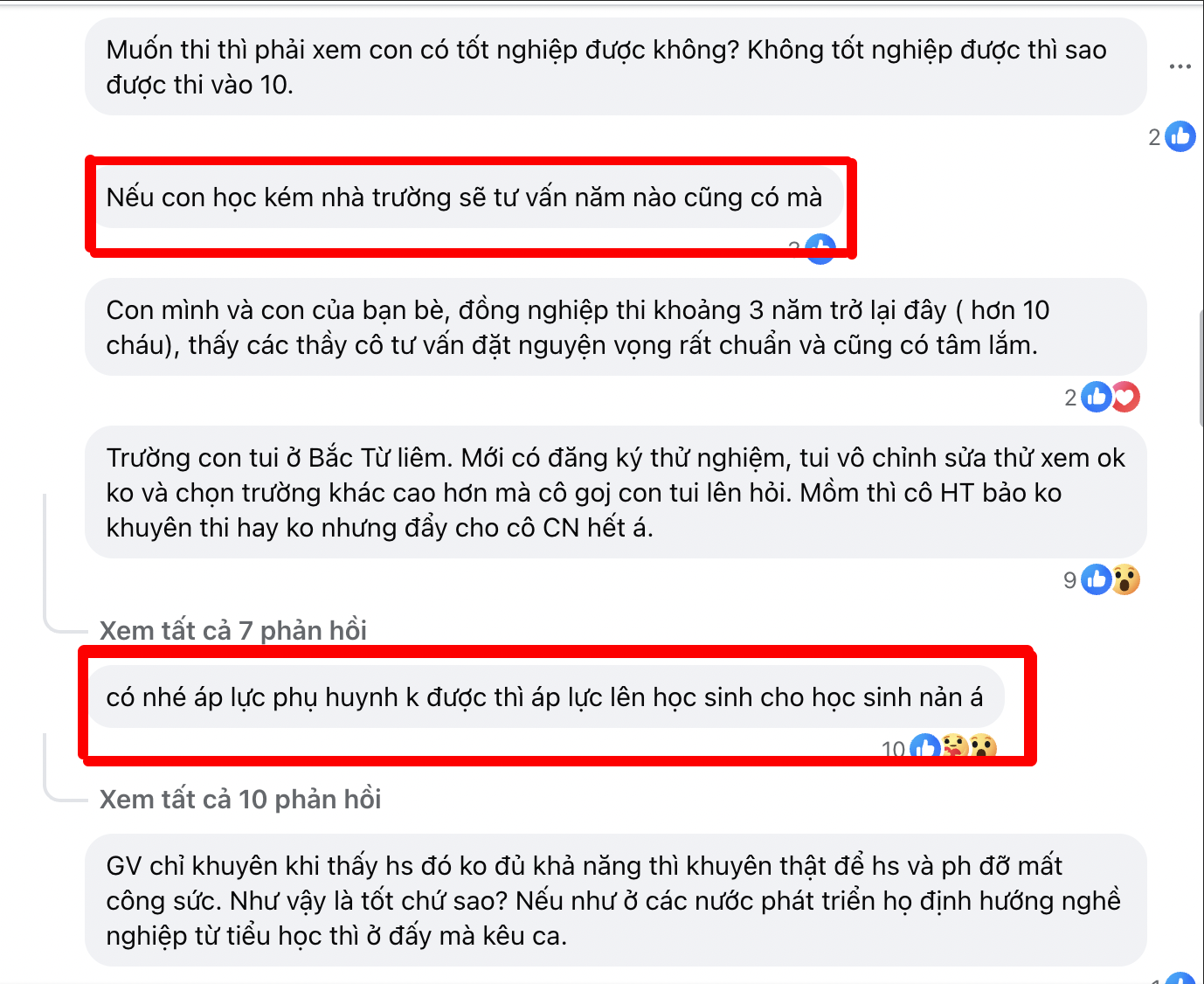 Một phụ huynh khác cho rằng: "Thầy cô chịu áp lực thành tích nên can thiệp quá sâu vào việc học sinh tham gia kỳ thi tuyển sinh lớp 10. Lời khuyên thậm chí là đề nghị học sinh không nên đăng ký thi vào 10 khiến con giảm ý chí, bất an, mất niềm tin vào khả năng của bản thân trong khi các con được đăng ký tới 3 nguyện vọng".