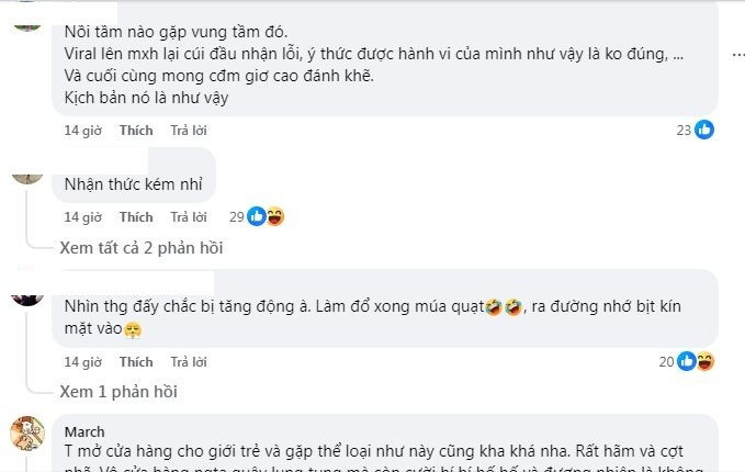 Nhiều người nhấn mạnh rằng dù việc làm đổ đồ là vô ý, nhưng thái độ cười đùa, múa quạt khi thấy người khác phải thu dọn hậu quả của mình là thiếu tôn trọng và kém văn minh trầm trọng: "Nhận thức kém nhỉ. Cười cợt được là thấy thái độ vô trách nhiệm rồi", "Làm đồ xong còn múa quạt, ra đường nhớ bịt kín mặt vào".