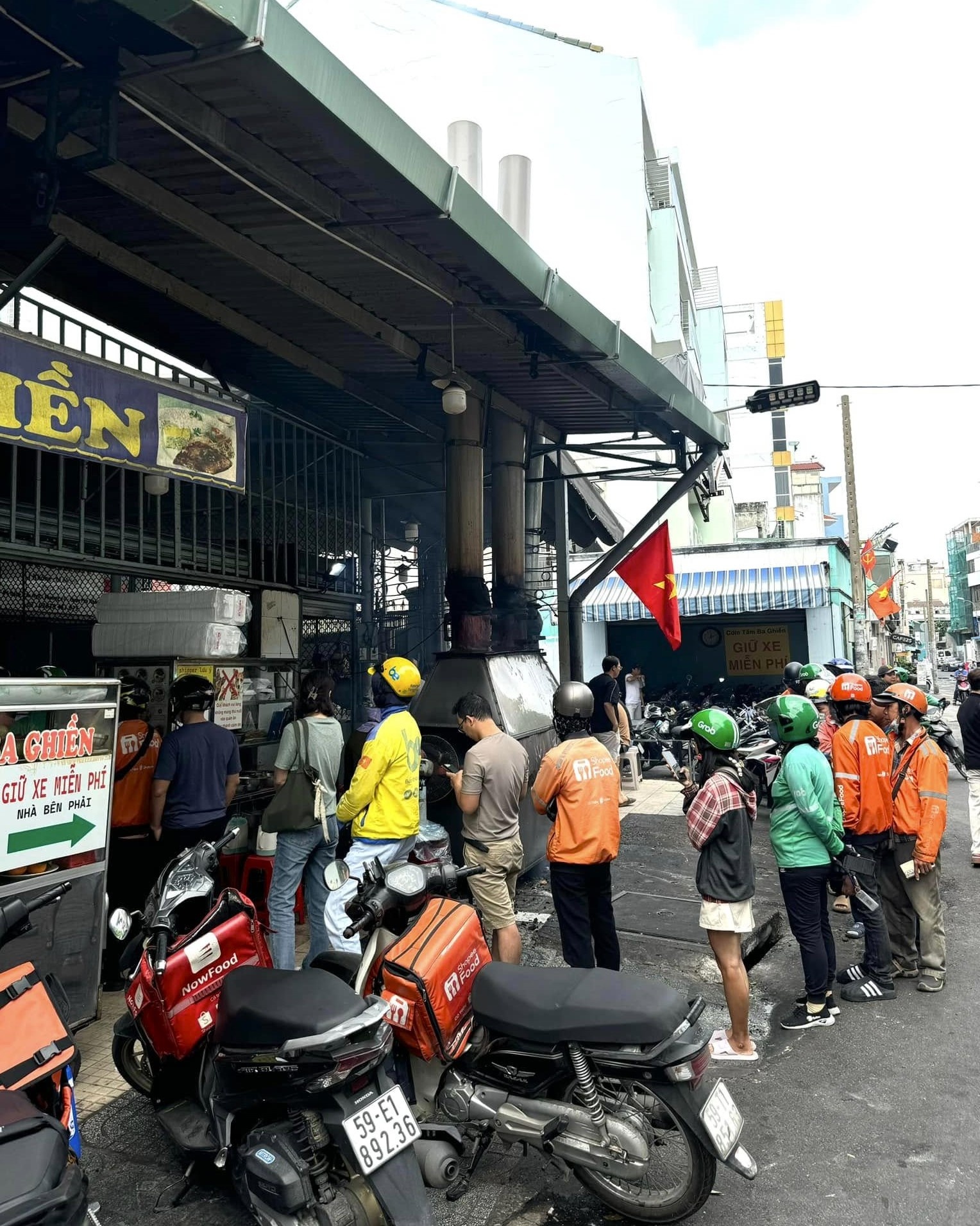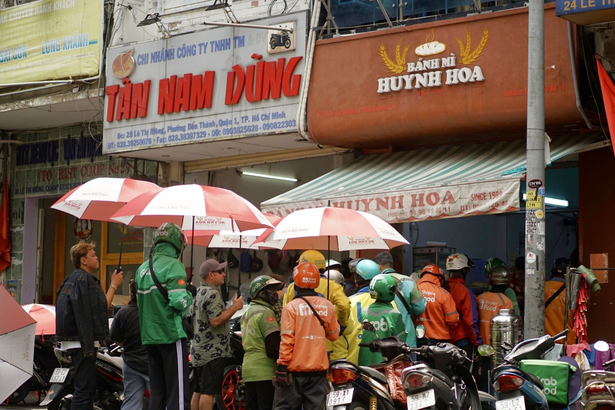 Lượng khách và shipper xếp hàng dài chờ mua bánh mì ở cửa hàng trên đường Lê Thị Riêng. Ảnh: Bánh mì Huynh Hoa.