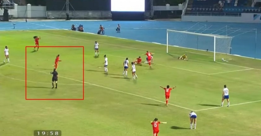 Ban đầu, trọng tài chính người Australia, bà Rebecca Anne Durcau, đã có động tác chỉ tay về vạch giữa sân, tín hiệu công nhận bàn thắng cho ĐT nữ Việt Nam. Tuy nhiên, chỉ vài giây sau, trợ lý trọng tài Chanthavong Phutsavan (Lào) bất ngờ căng cờ báo việt vị.