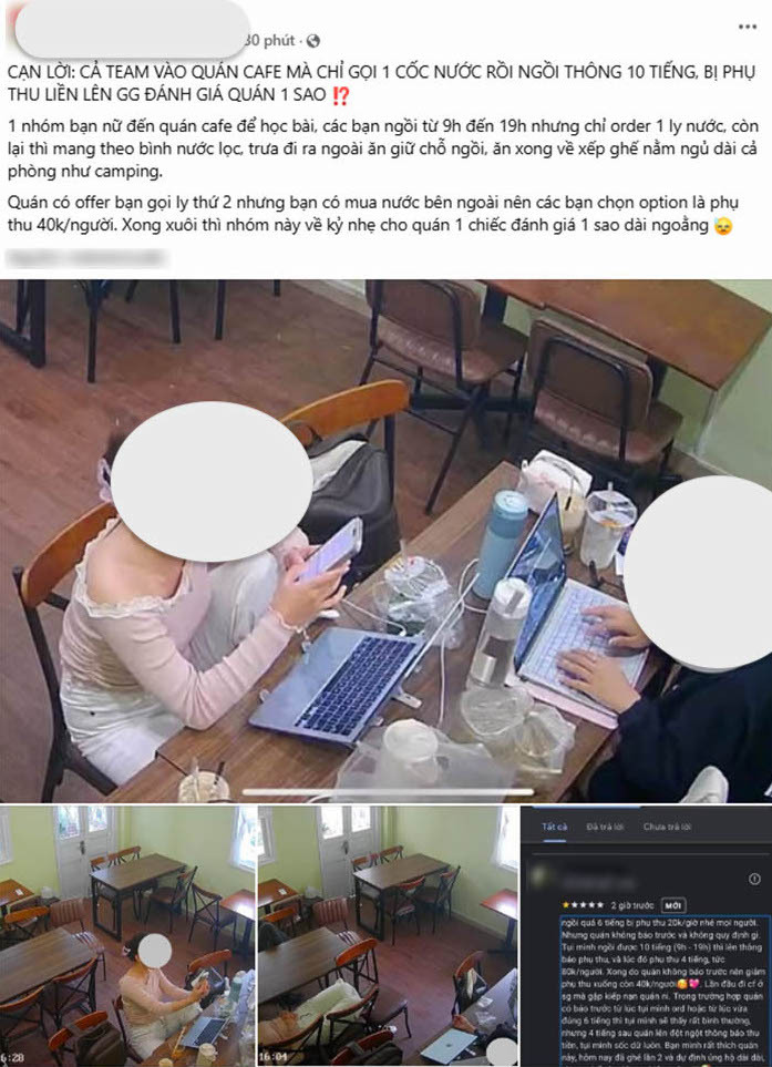 Phía quán cho biết đã đề nghị khách gọi thêm đồ uống nhưng không được chấp nhận. Cuối cùng, quán áp dụng phụ thu 40.000 đồng/người do thời gian sử dụng chỗ ngồi kéo dài.