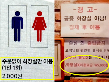 Ảnh chụp trên mạng xã hội có nội dung yêu cầu khách hàng không mua dịch vụ thì phải trả 2.000-5.000 won (khoảng 35.000-87.000 đồng) nếu dùng nhà vệ sinh. Ảnh: Internet