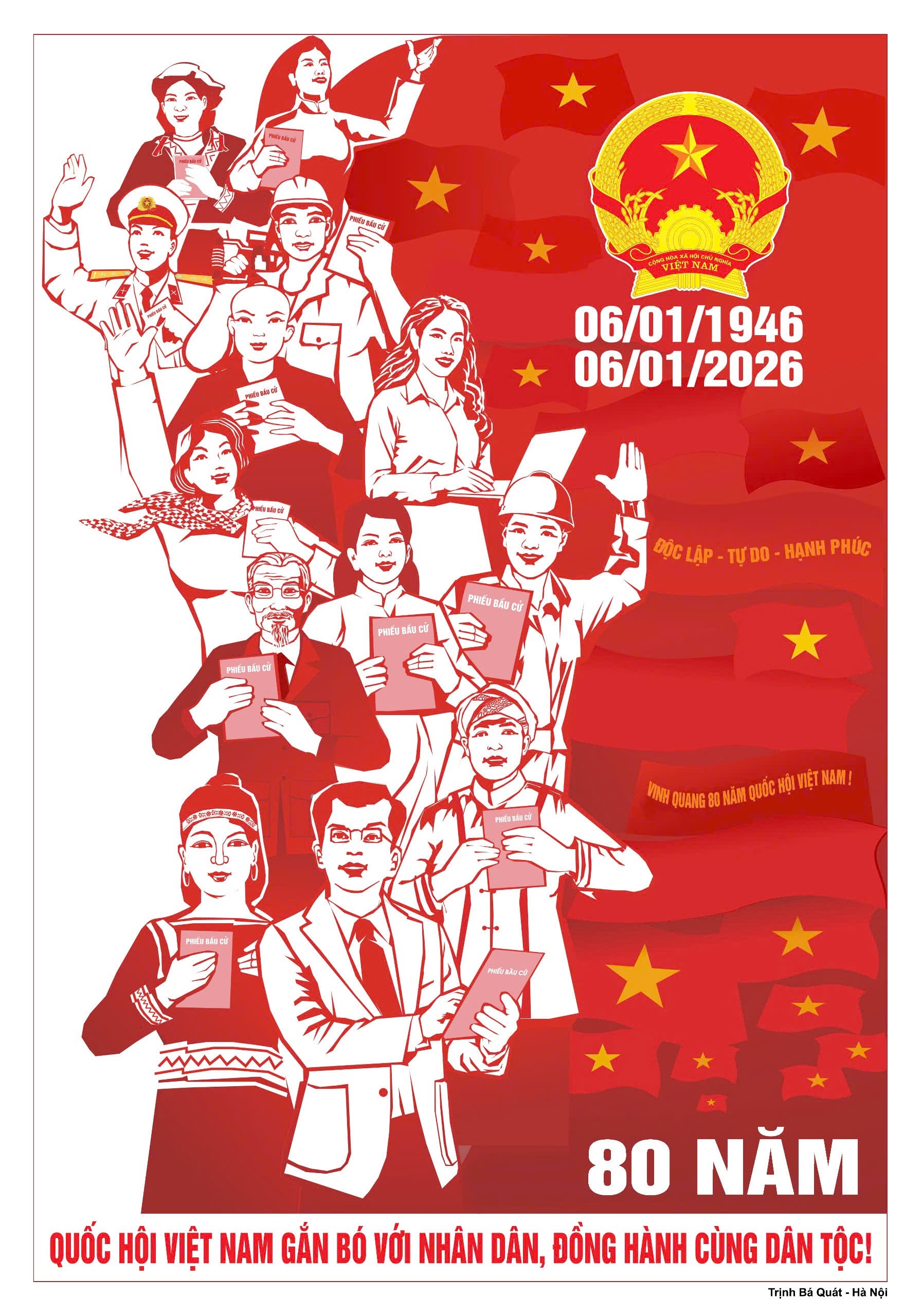 Với ý nghĩa như vậy, trong khuôn khổ triển lãm Quốc hội Việt Nam - 80 năm đồng hành cùng dân tộc tổ chức tại Nhà Quốc hội ngày 6/1/2026, sẽ trưng bày một số tác phẩm tranh cổ động tiêu biểu. Đây là kết quả Cuộc thi tranh cổ động tuyên truyền kỷ niệm 80 năm Ngày Tổng tuyển cử đầu tiên bầu Quốc hội Việt Nam (6/1/1946 - 6/1/2026) phát động từ ngày 21/4 - 31/5/2025. Ban Tổ chức nhận được 450 tác phẩm dự thi. Ban giám khảo, Ban tư vấn đã tuyển chọn được trao giải cho 15 tác phẩm, gồm: 1 giải nhất, 2 giải nhì, 3 giải ba, 9 giải khuyến khích.