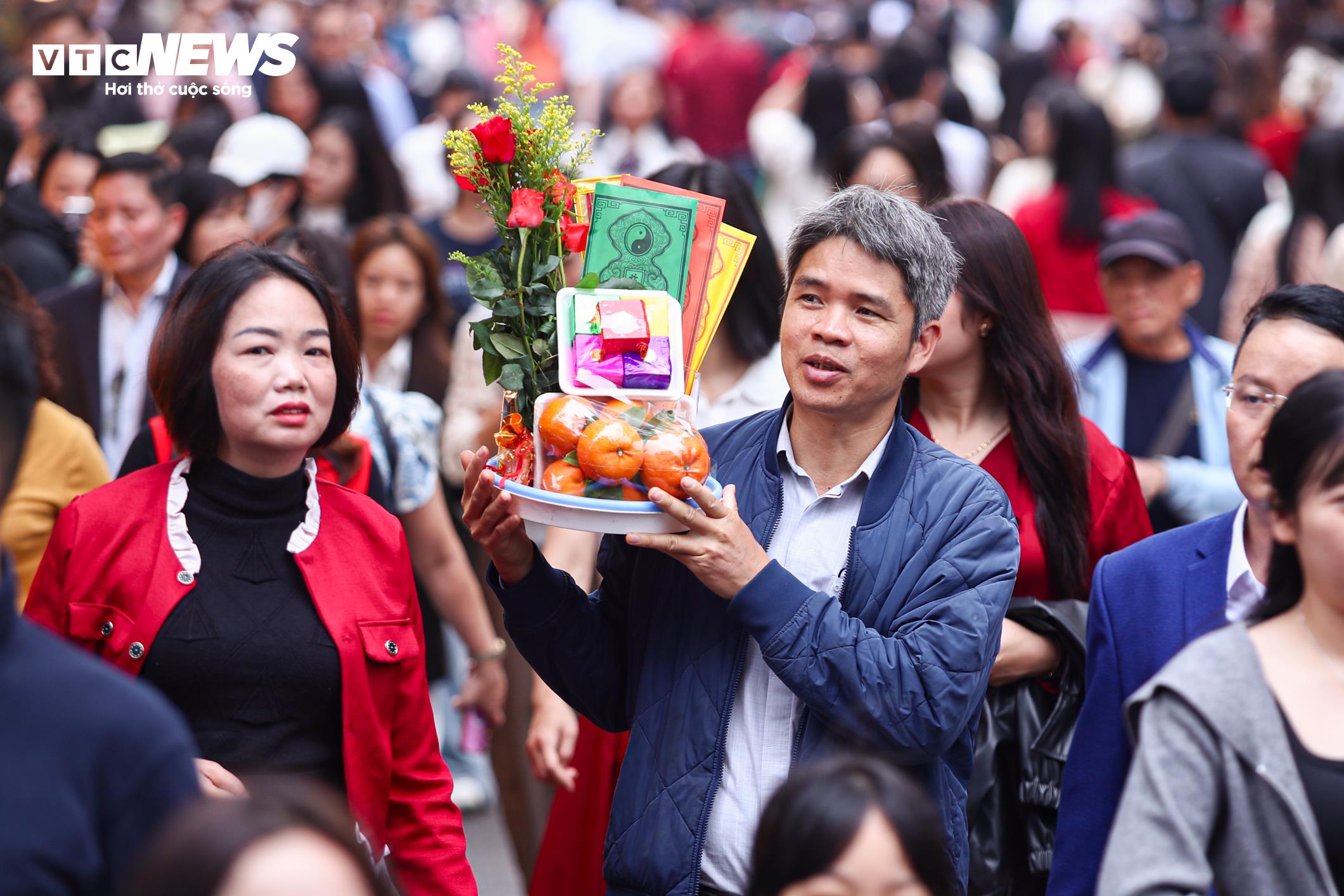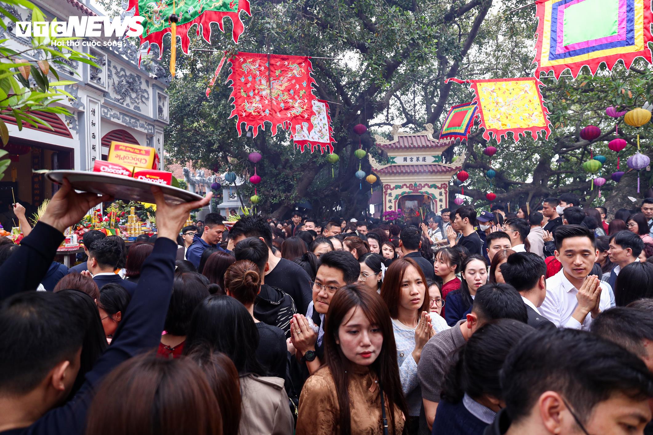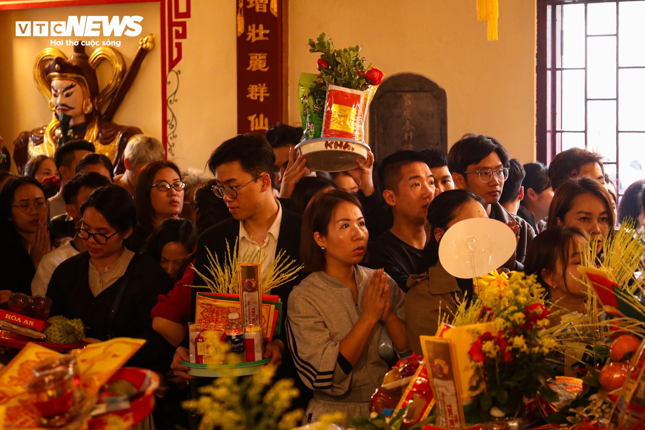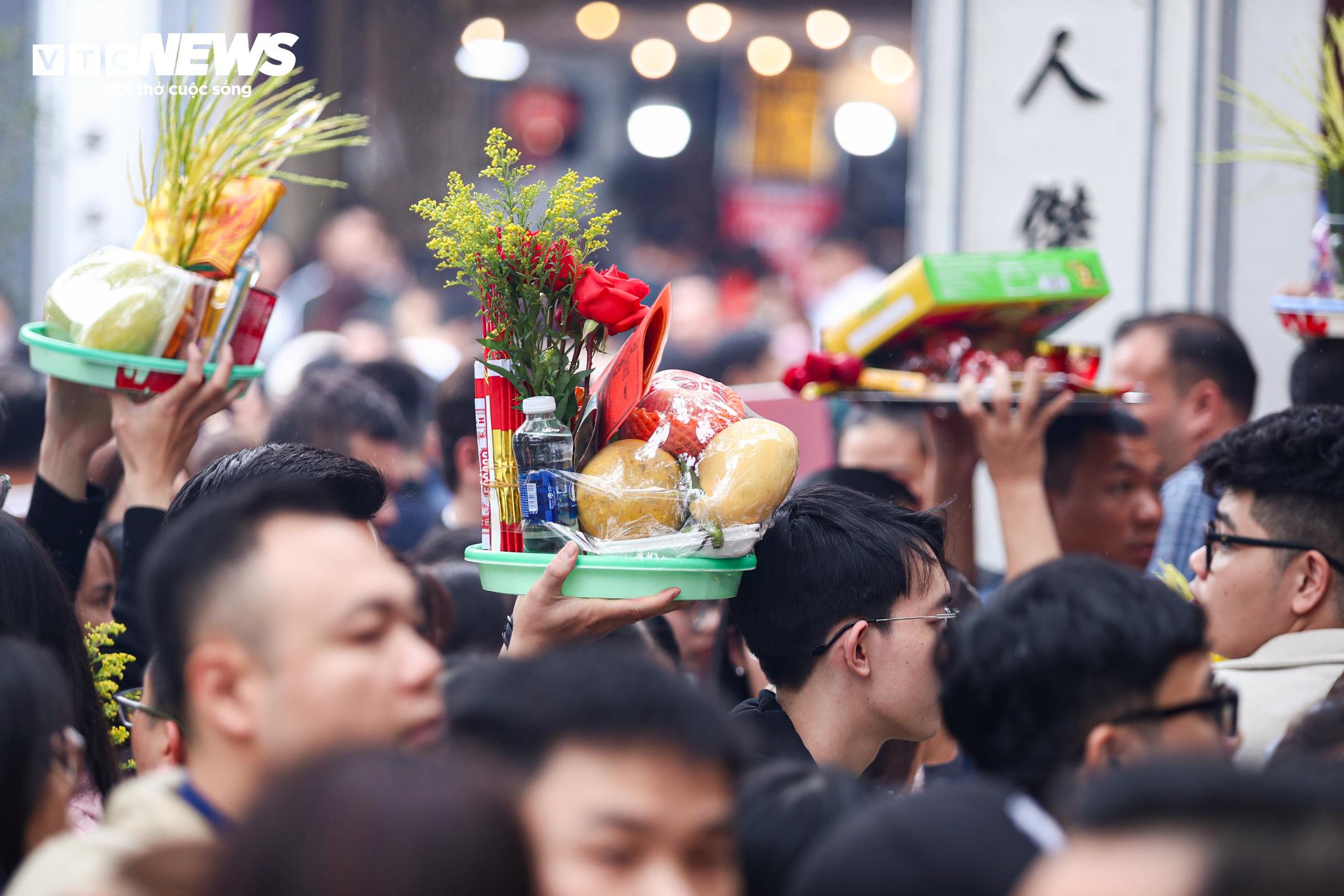 Giữa dòng người đông nghịt, việc tìm được một khoảng trống để len vào bên trong đền không hề dễ dàng, nhiều người loay hoay mãi mới tìm được chỗ đặt mâm lễ.