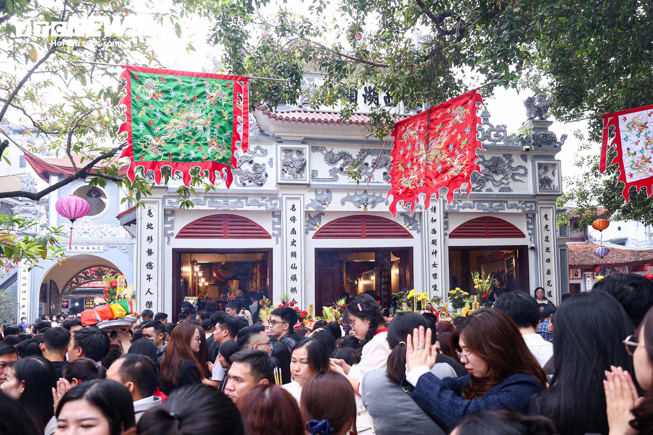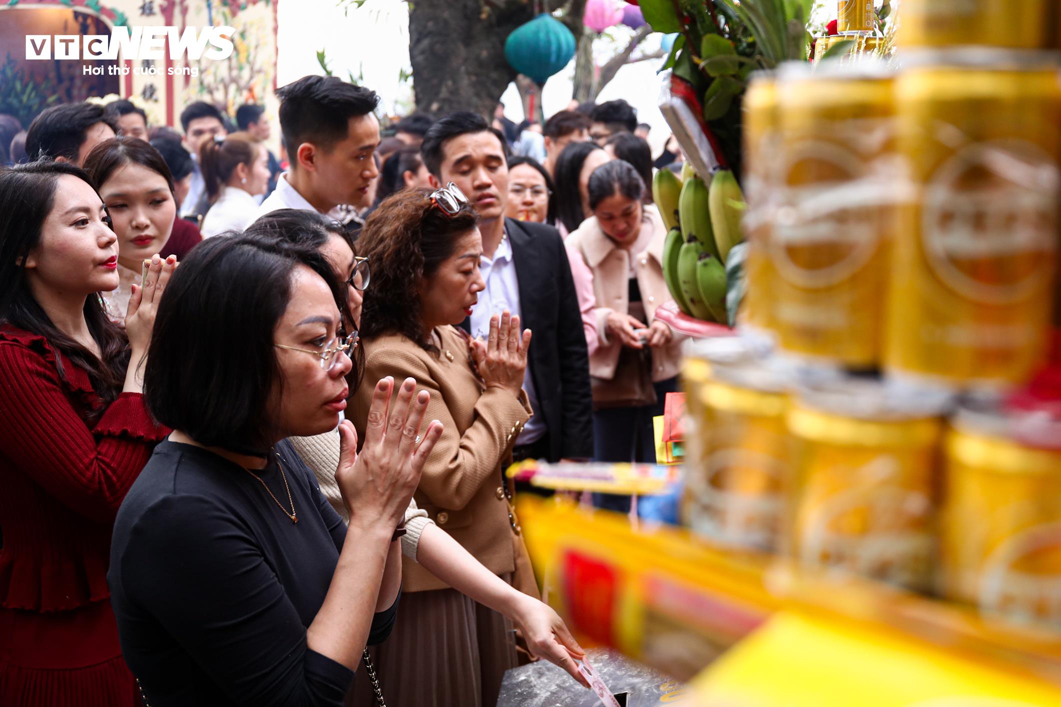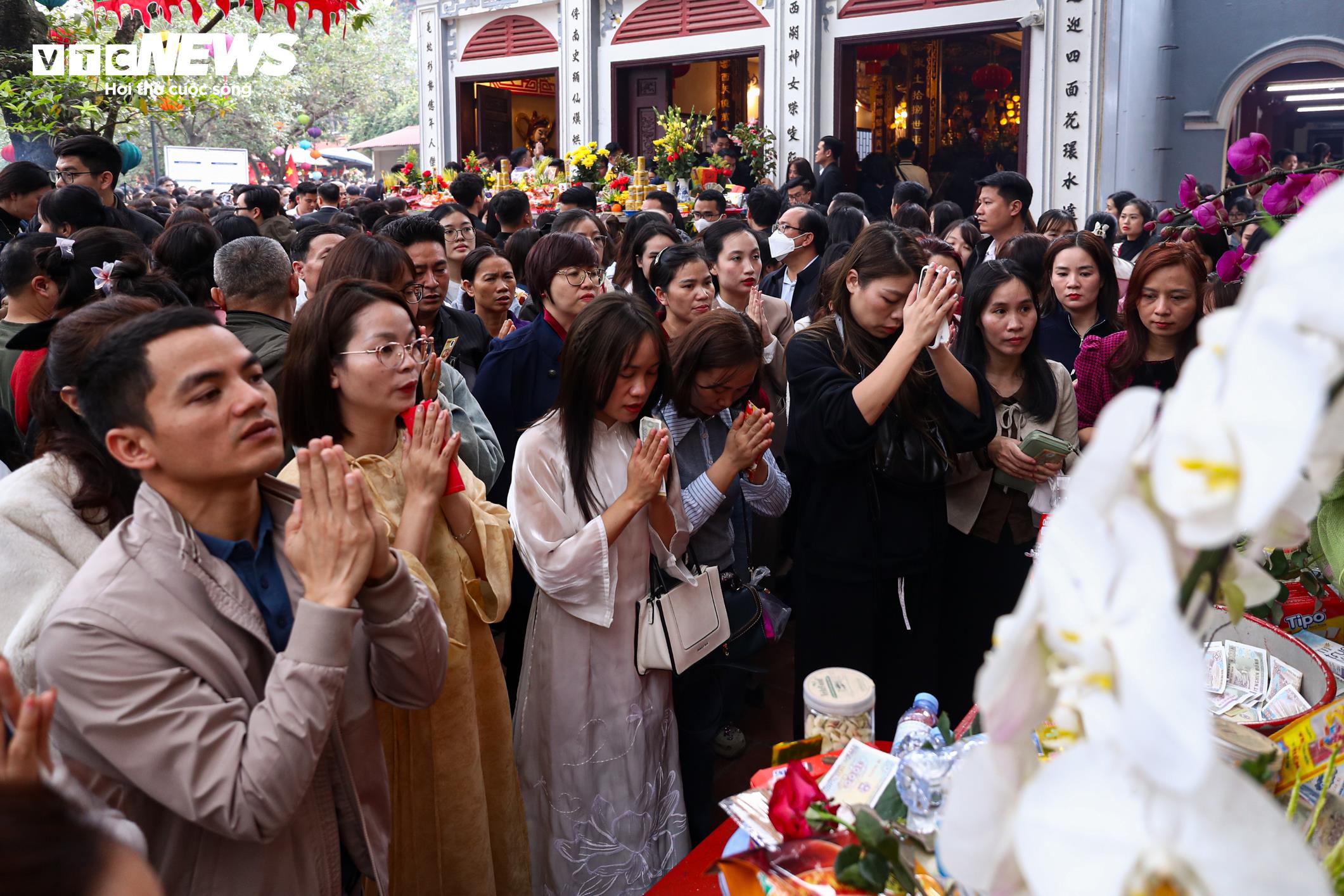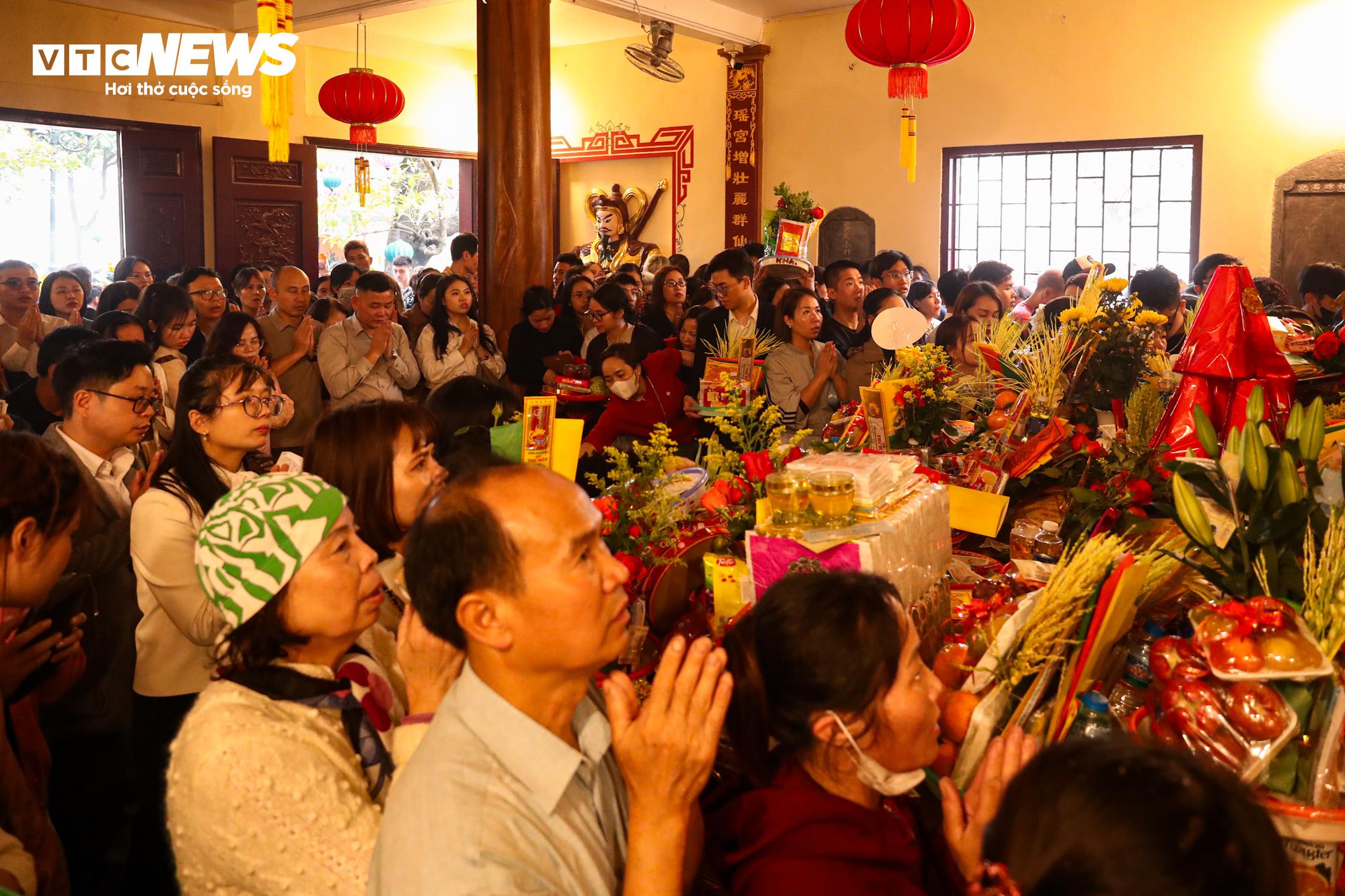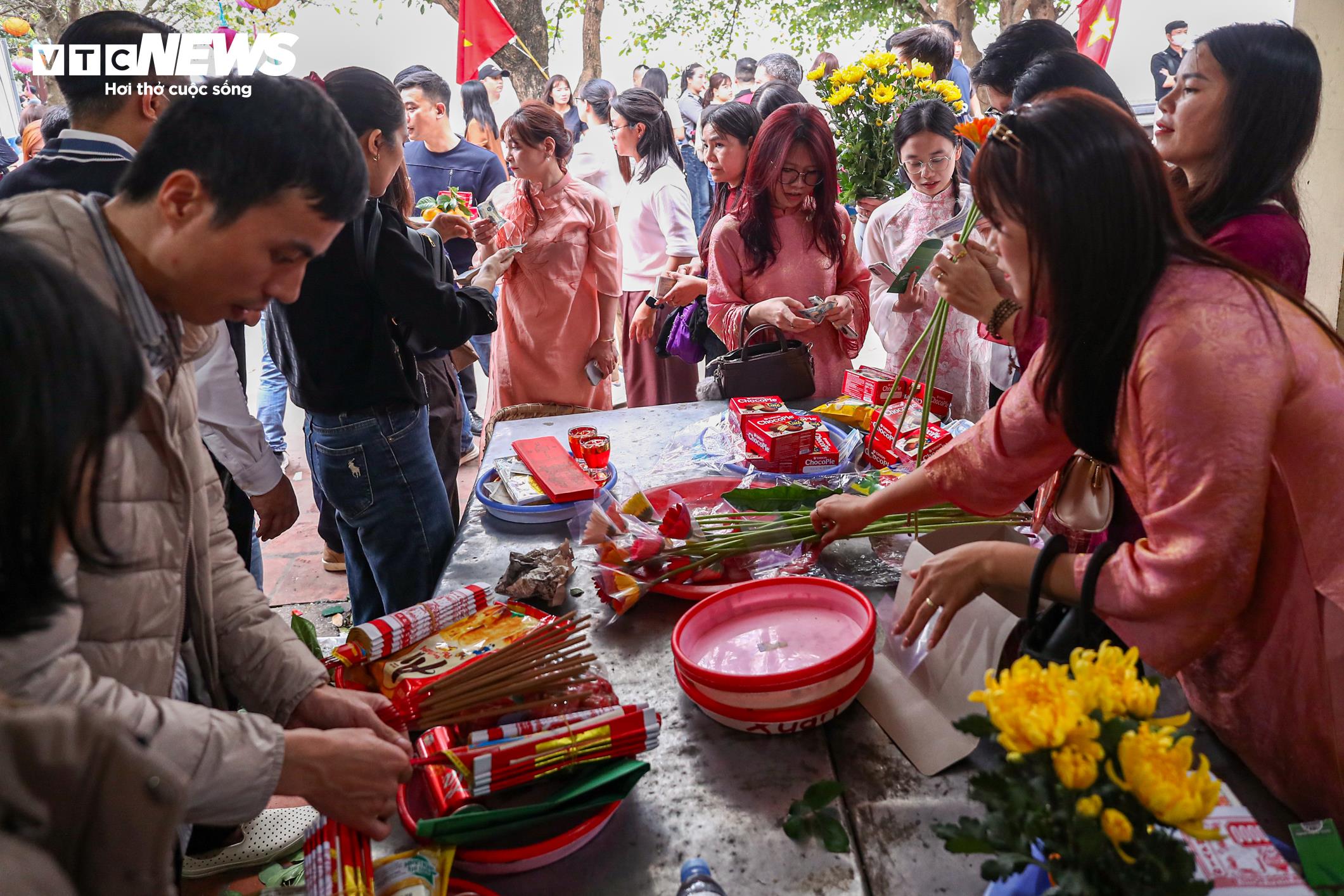 Giữa dòng người đông nghịt, việc tìm được một khoảng trống để len vào bên trong đền không hề dễ dàng, nhiều người loay hoay mãi mới tìm được chỗ đặt mâm lễ.