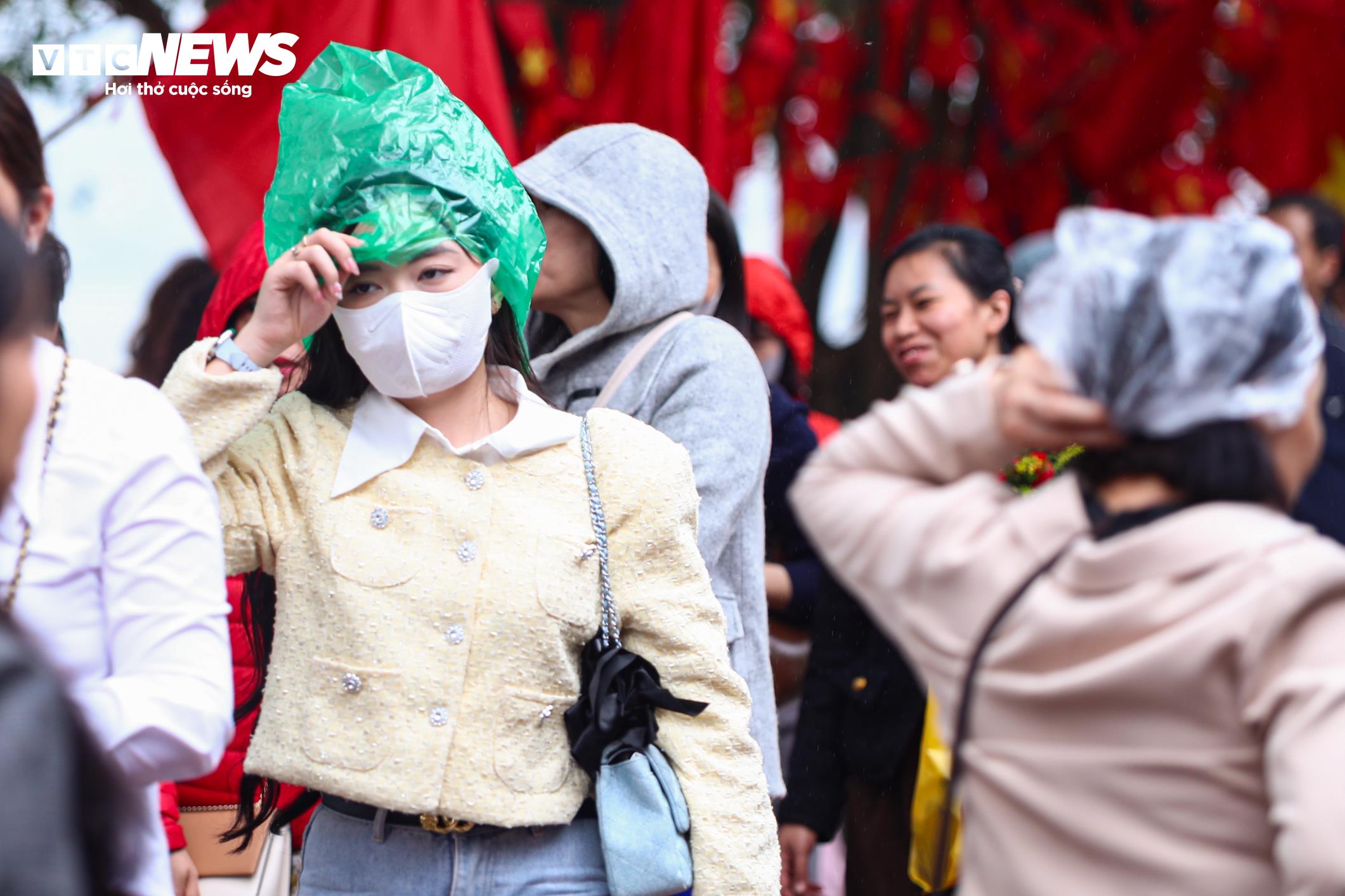 Đầu giờ chiều, mưa phùn xuất hiện, nhiều người đi lễ phải dùng ô và túi nilon che chắn khi vào Phủ Tây Hồ dâng hương.