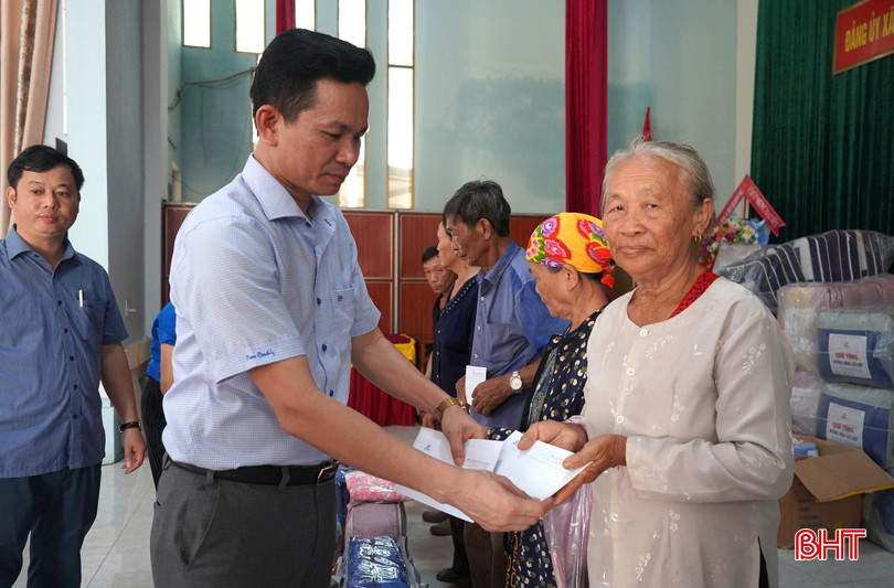 Tiếp đó, Công ty TNHH Hàn Việt cũng đã trao tặng 100 suất quà cho các hộ nghèo, gia đình có hoàn cảnh khó khăn trên địa bàn xã Nghi Xuân cũng bị thiệt hại nặng nề do cơn bão số 10 gây ra. Trong ảnh: Ông Trần Chí Thanh, Tổng Giám đốc Công ty Hàn Việt trao quà cho các hộ khó khăn tại thôn Xuân Hồng 1, xã Nghi Xuân.