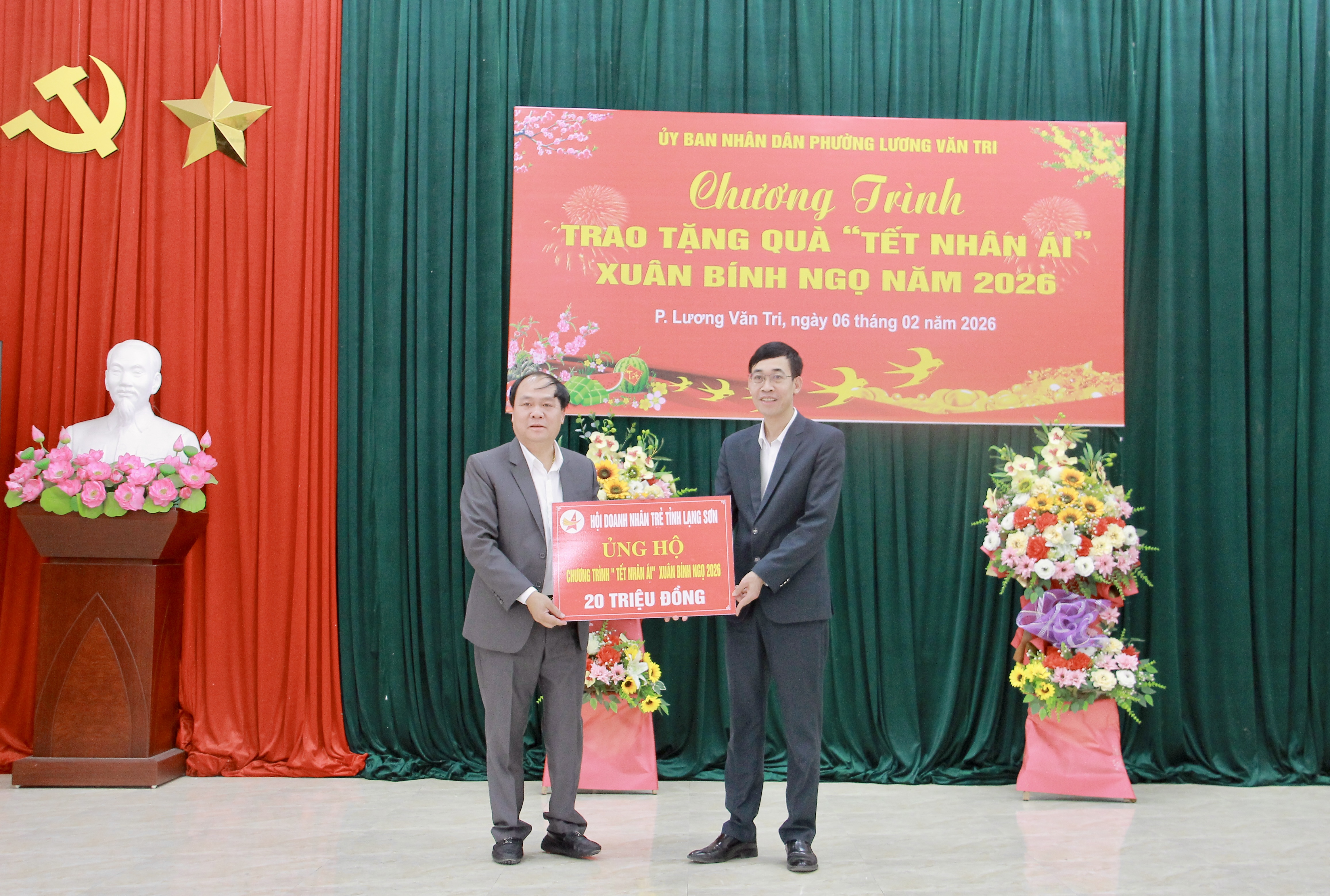 Đại diện Hội Doanh nhân trẻ tỉnh Lạng Sơn trao biển ủng hộ kinh phí thực hiện Chương trình “Tết Nhân ái” Xuân Bính Ngọ 2026 cho lãnh đạo phường Lương Văn Tri