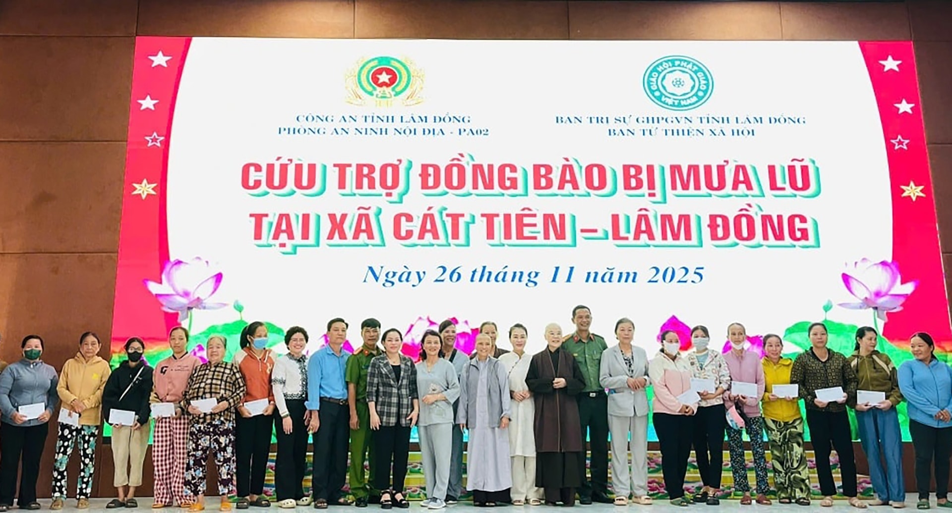 Phòng An ninh Nội địa, Công an tỉnh Lâm Đồng phối hợp với Ban Trị sự Giáo hội Phật giáo Việt Nam tỉnh trao tặng các phần quà cho người dân xã Cát Tiên