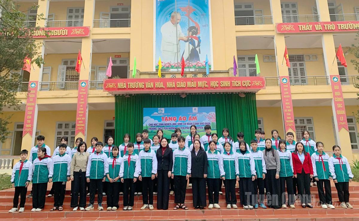 Các đại biểu trao áo ấm cho học sinh trường THCS Yên Hương.