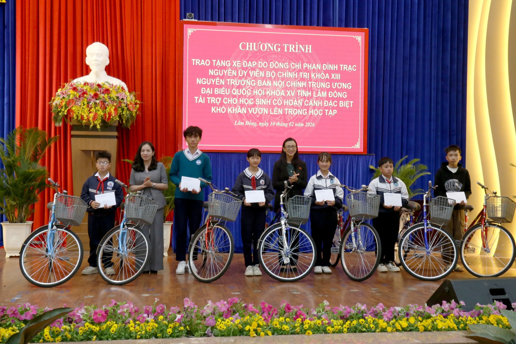 Các đồng chí Nguyễn Minh, Phó Chủ tịch UBND tỉnh Lâm Đồng; Lê Thị Bích Liên, Giám đốc Sở Giáo dục và Đào tạo trao xe đạp cho học sinh có hoàn cảnh khó khăn