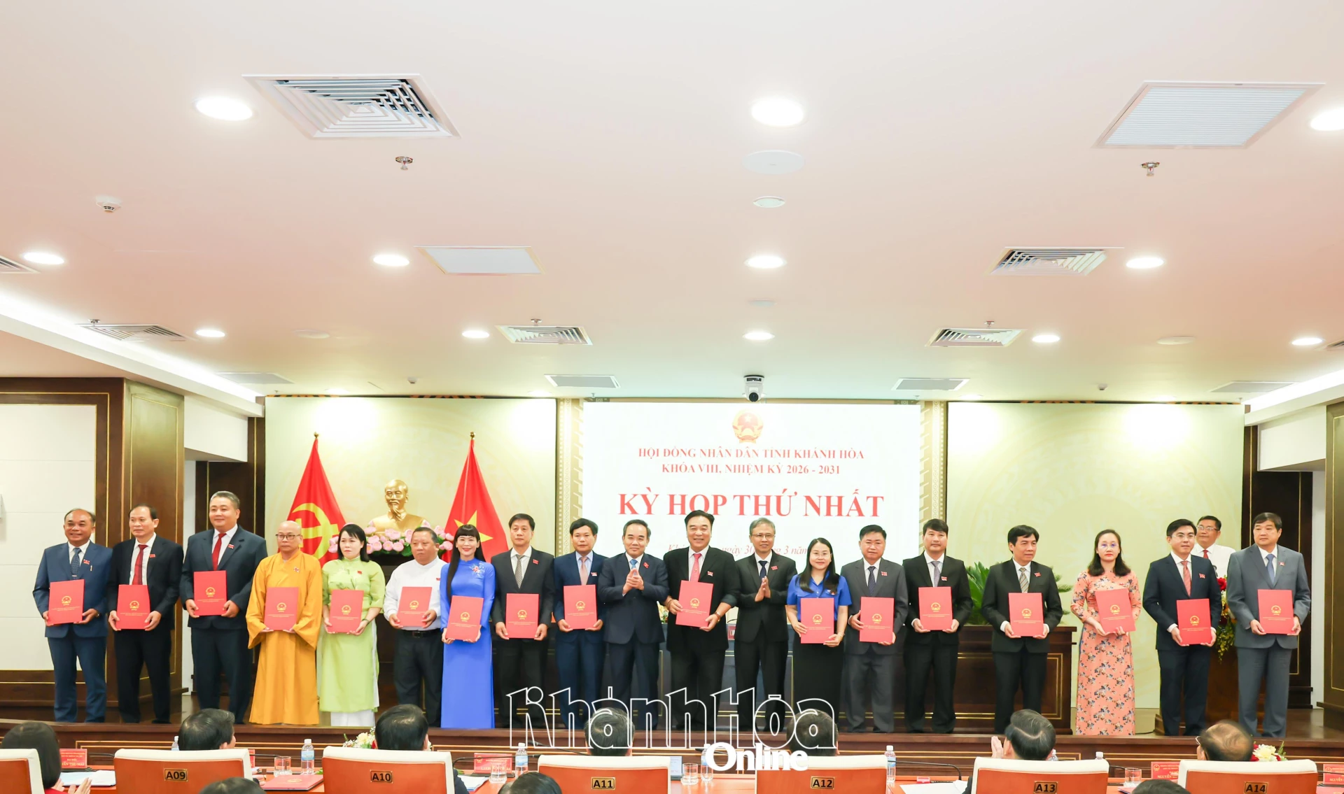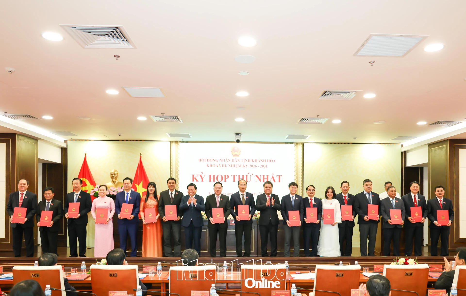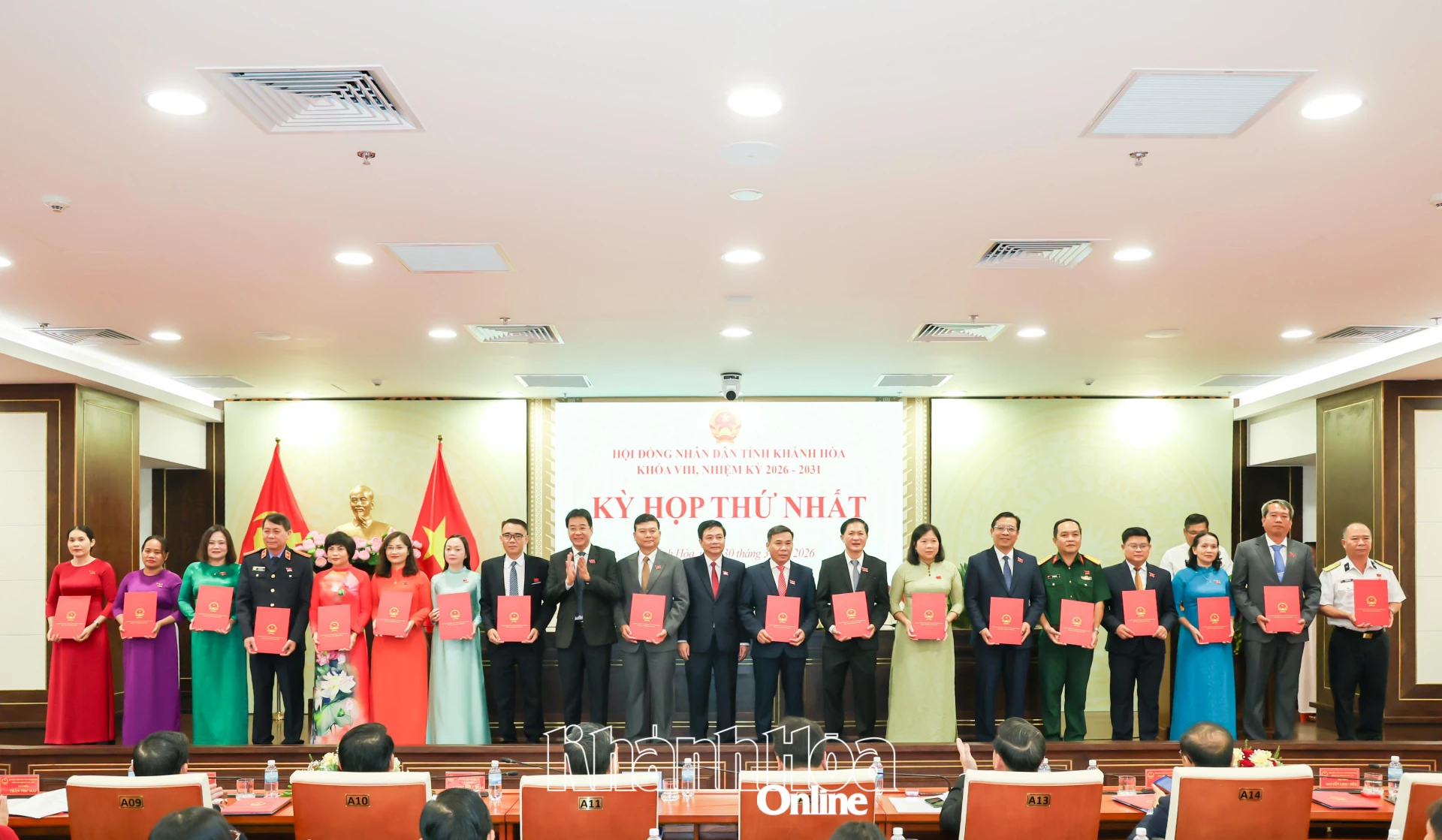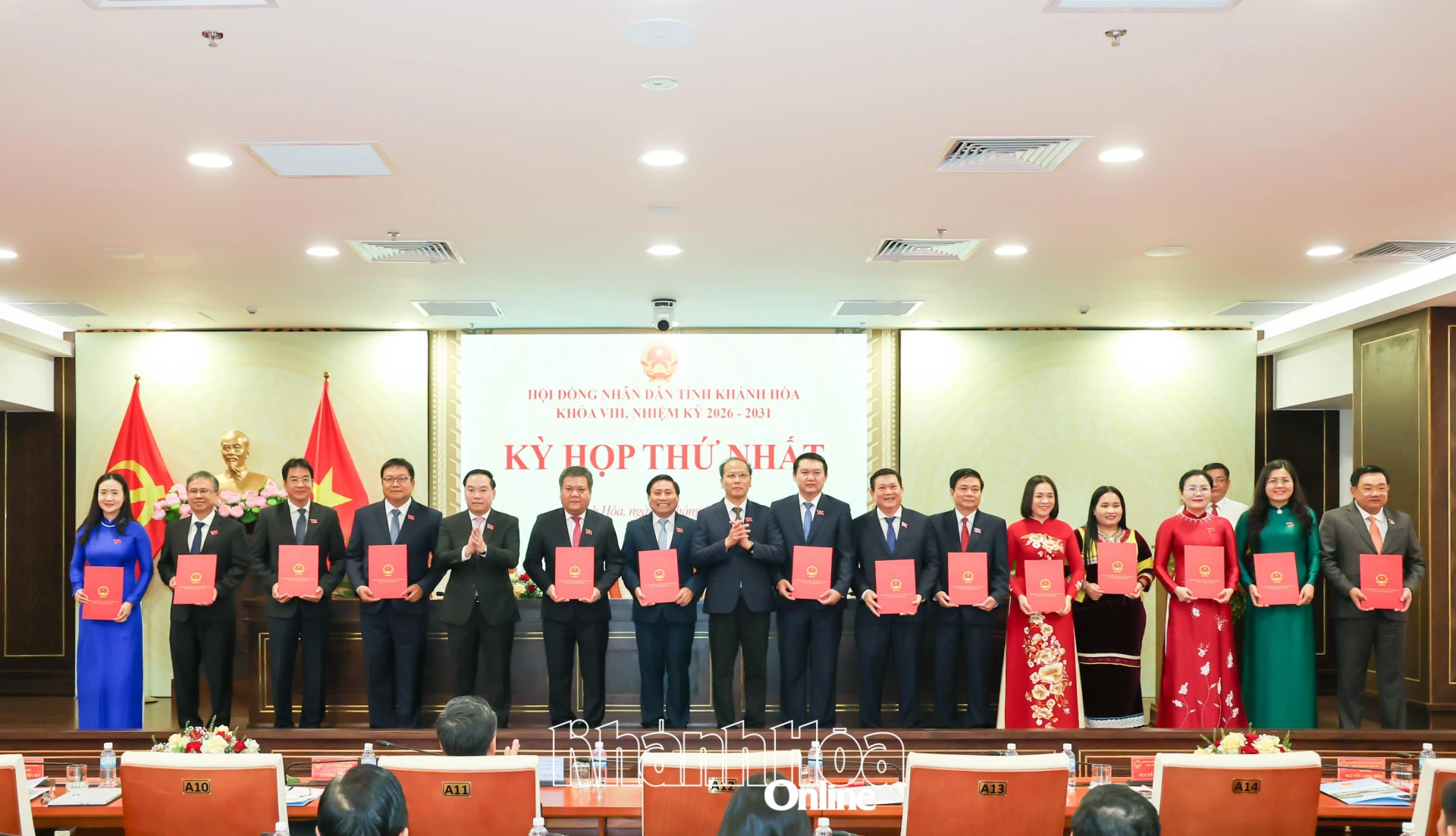Đồng chí Hồ Xuân Trường - Ủy viên dự khuyết Trung ương Đảng, Phó Bí thư Thường trực Tỉnh ủy và đồng chí Nguyễn Khắc Hà - Phó Bí thư Tỉnh ủy, Chủ tịch Ủy ban MTTQ Việt Nam tỉnh trao giấy chứng nhận đại biểu HĐND tỉnh Khánh Hòa khóa VIII, nhiệm kỳ 2026 - 2031 cho các đại biểu.
