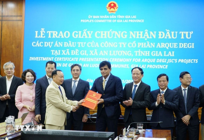 Lãnh đạo Ủy ban Nhân dân tỉnh Gia Lai trao Giấy chứng nhận đầu tư dự án bến siêu du thuyền 8.500 tỷ đồng. (Ảnh: Sỹ Thắng/TTXVN)