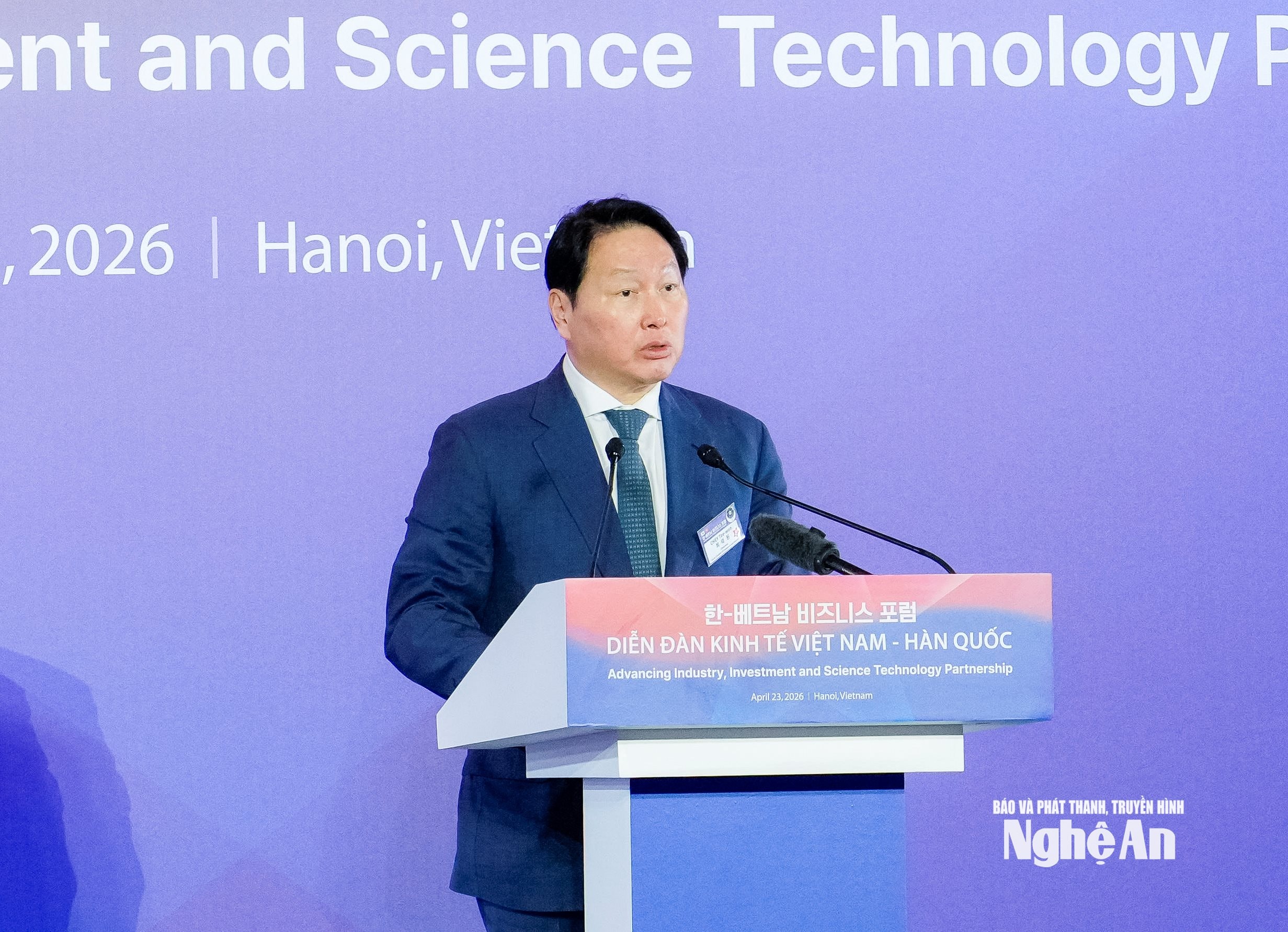 Chủ tịch Phòng Thương mại và Công nghiệp Hàn Quốc (KCCI) kiêm Chủ tịch Tập đoàn SK Choi Tae Won phát biểu tại diễn đàn. Ảnh: Phạm Bằng