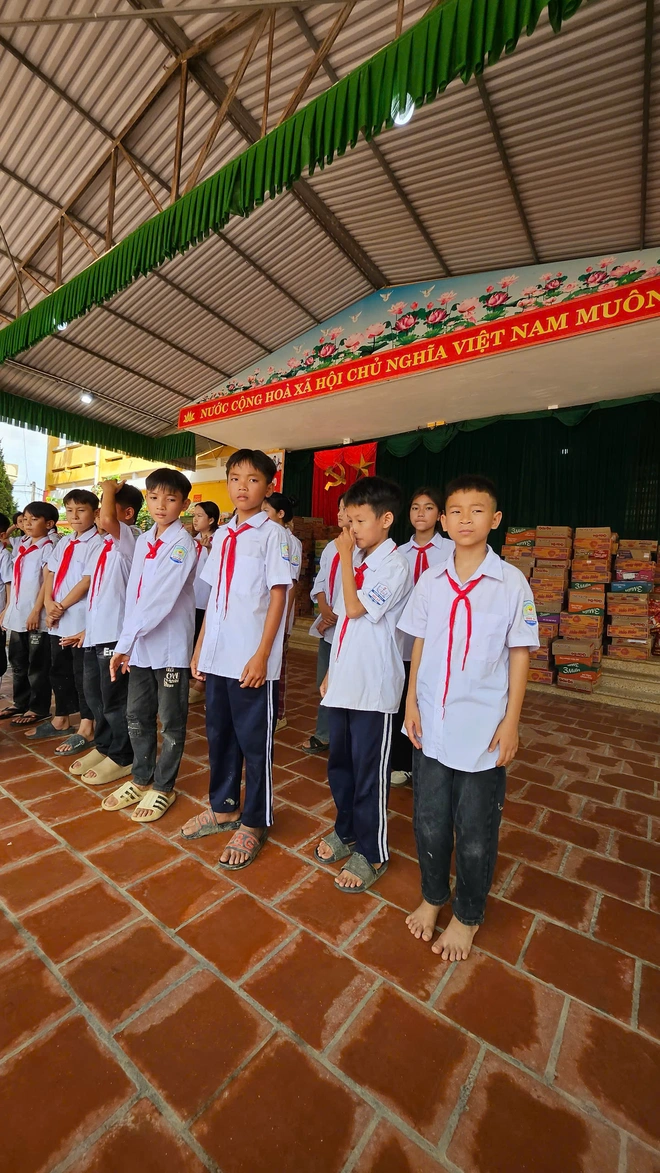 + Hihiii, con ngại quá, con bị đứt dép khi chạy lũ, mẹ con bận quá chưa kịp mua dép mới cho con, nhưng được đi học là con vui, hôm nay được tặng sách vở và đồ dùng học tập con lại càng vui…