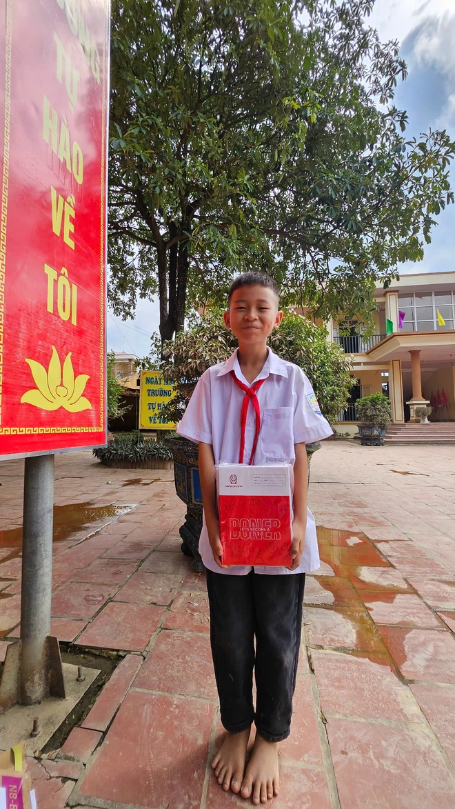 Dù mẹ Tuấn Anh chưa kịp mua cho em đôi dép mới, nhưng em vẫn hớn hở khi được trở lại trường, với bộ quần áo còn lấm lem bùn đất đỏ và đôi chân trần khiến em bẽn lẽn khi đứng đón đoàn các thầy cô giáo, các bạn học cùng trang lứa và các phụ huynh của Trường THCS và THPT Lê Quý Đôn (phường Từ Liêm, Thành phố Hà Nội) đến thăm hỏi, động viên, hỗ trợ, tiếp sức thầy và trò của Tuấn Anh sớm trở lại hành trình dạy và học bình thường.