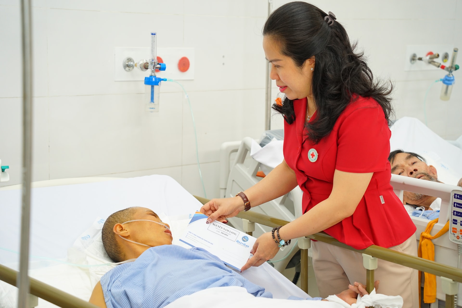 Bà Nguyễn Thị Thanh Nhàn, Phó Chủ tịch Hội Chữ Thập đỏ tỉnh Lâm Đồng trao quà cho bệnh nhân