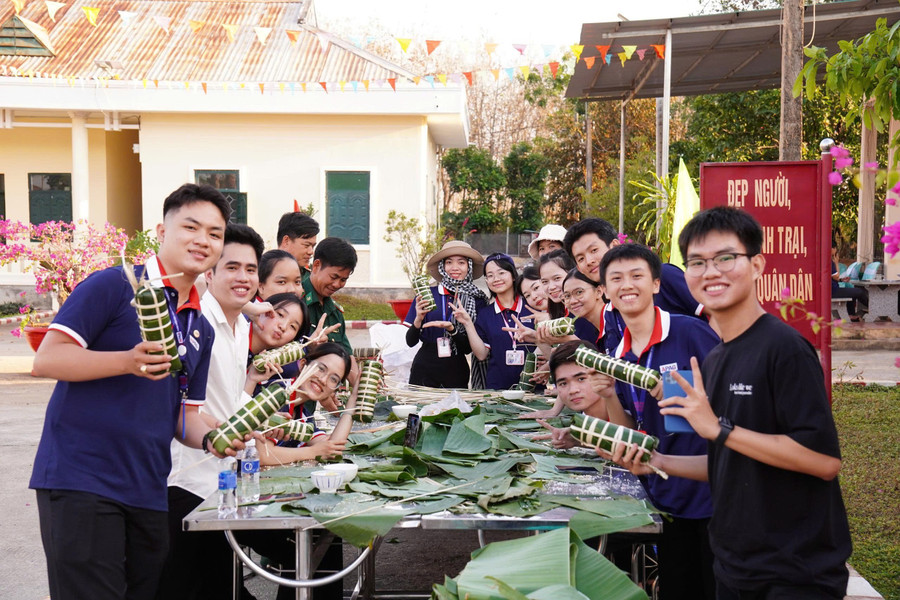 Cán bộ, chiến sĩ Đồn Biên phòng Đăk Ơ giao lưu, gói bánh tét cùng đoàn viên, sinh viên.