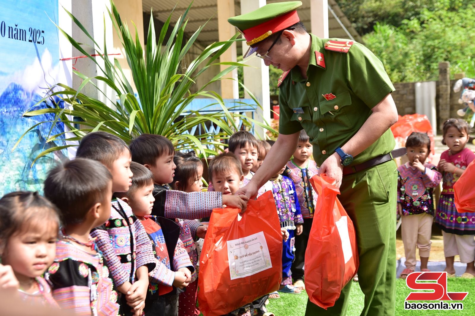 Đại diện Công an xã Vân Hồ trao quà cho trẻ em có hoàn cảnh khó khăn tại điểm trường Mầm non Pa Cốp 2.
