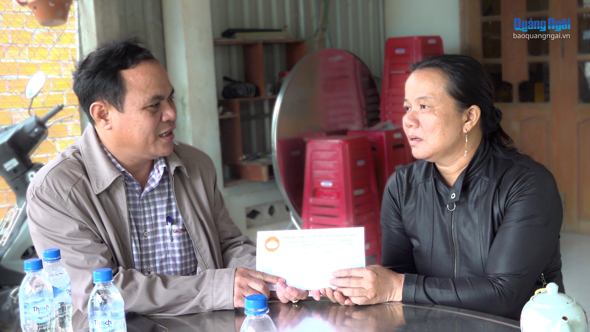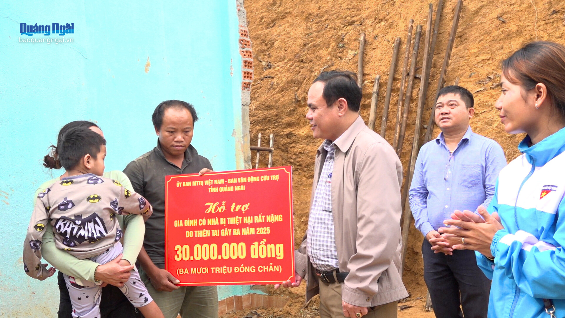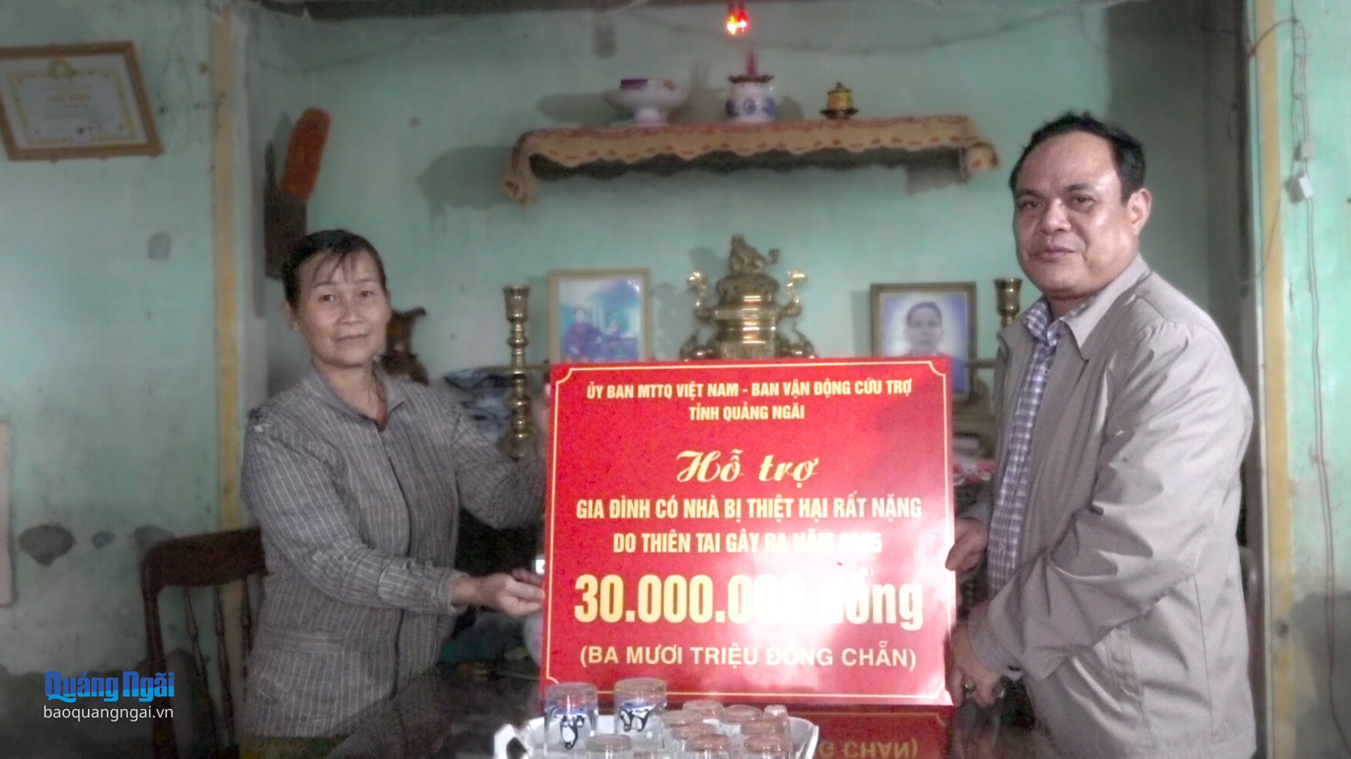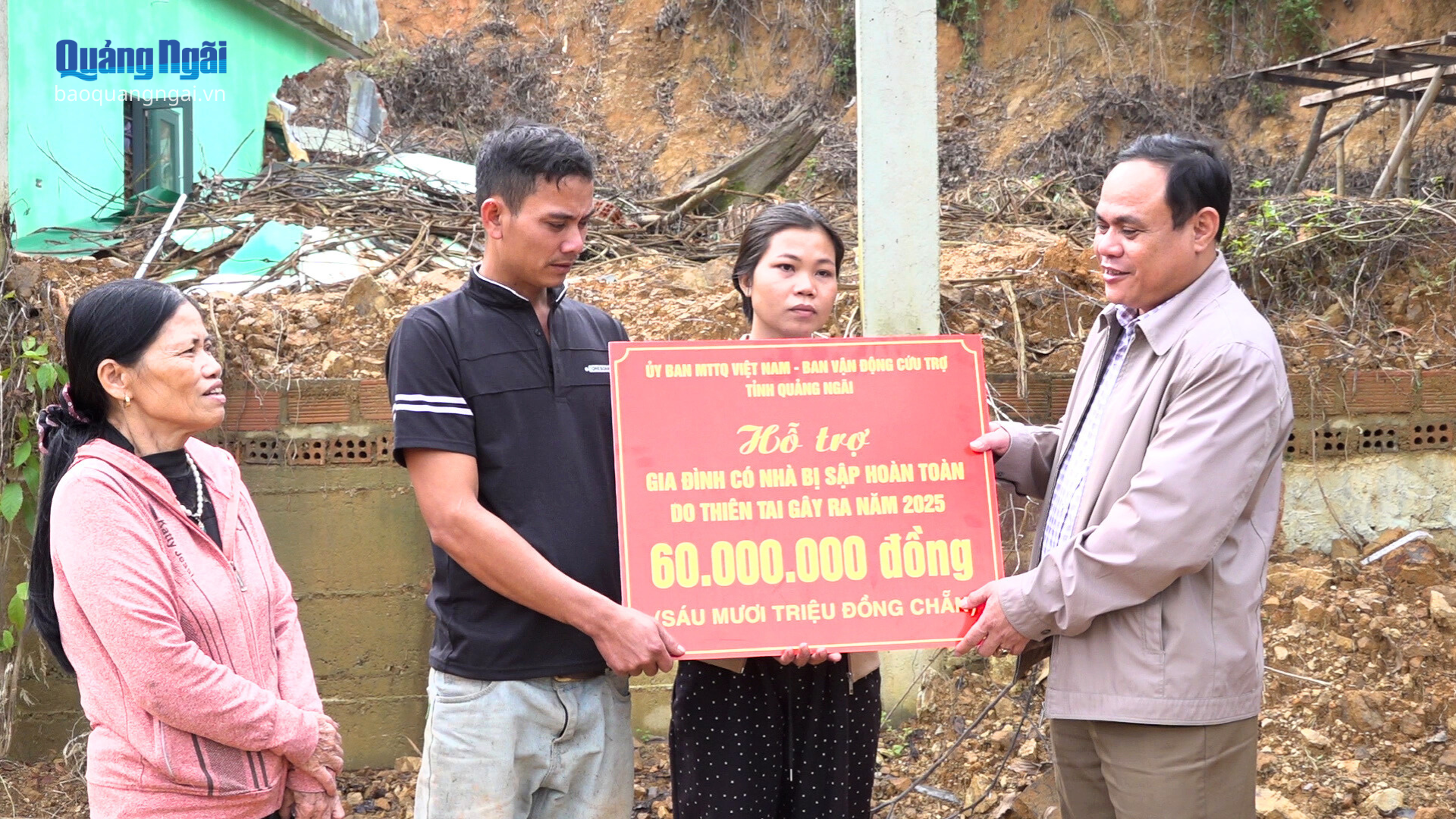 Phó Chủ tịch Ủy ban MTTQ Việt Nam tỉnh Hồ Ngọc Thịnh đã trao bảng tượng trưng hỗ trợ 60 triệu đồng cho gia đình chị Đinh Thị Đen (30 tuổi) và trao bảng tượng trưng hỗ trợ 30 triệu đồng cho gia đình chị Đinh Thị Thoa, cùng ngụ thôn Làng Bồ, xã Sơn Hà có nhà bị hư hỏng, sập hoàn toàn do mưa lũ vừa qua.