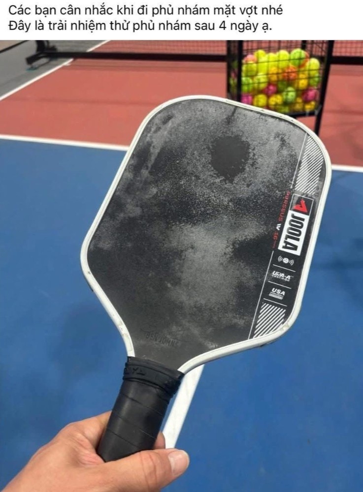 Một tài khoản mạng xã hội cảnh báo về tình trạng mốc, hỏng vợt pickleball sau 4 ngày sử dụng dịch vụ phủ nhám. Ảnh: Nguyen Quang Huy/Facebook.
