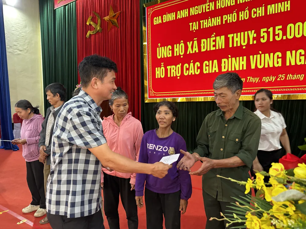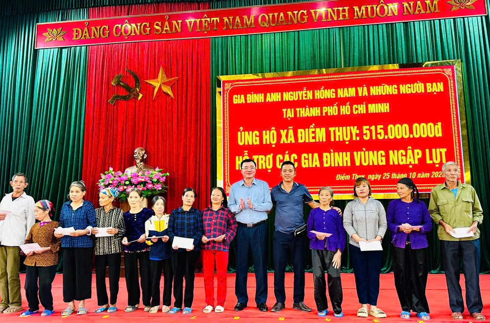 Ông Nguyễn Hồng Nam (đứng giữa bên phải) cùng ông Lê Thanh Sơn, Bí thư Đảng ủy, Chủ tịch UBND xã Điềm Thủy, tỉnh Thái Nguyên trao tiền hỗ trợ người dân vùng lũ sông Cầu bị thiệt hại do bão số 11.