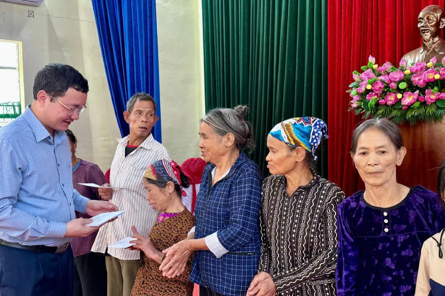 Ông Lê Thanh Sơn, Bí thư Đảng ủy - Chủ tịch UBND xã Điềm Thụy, tỉnh Thái Nguyên trao tiền hỗ trợ người dân xã Điềm Thụy-bị thiệt hại do bão số 11.